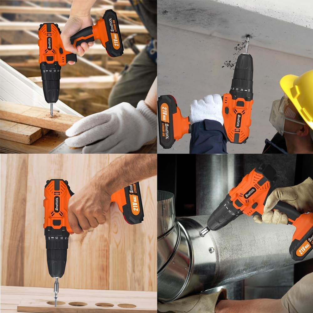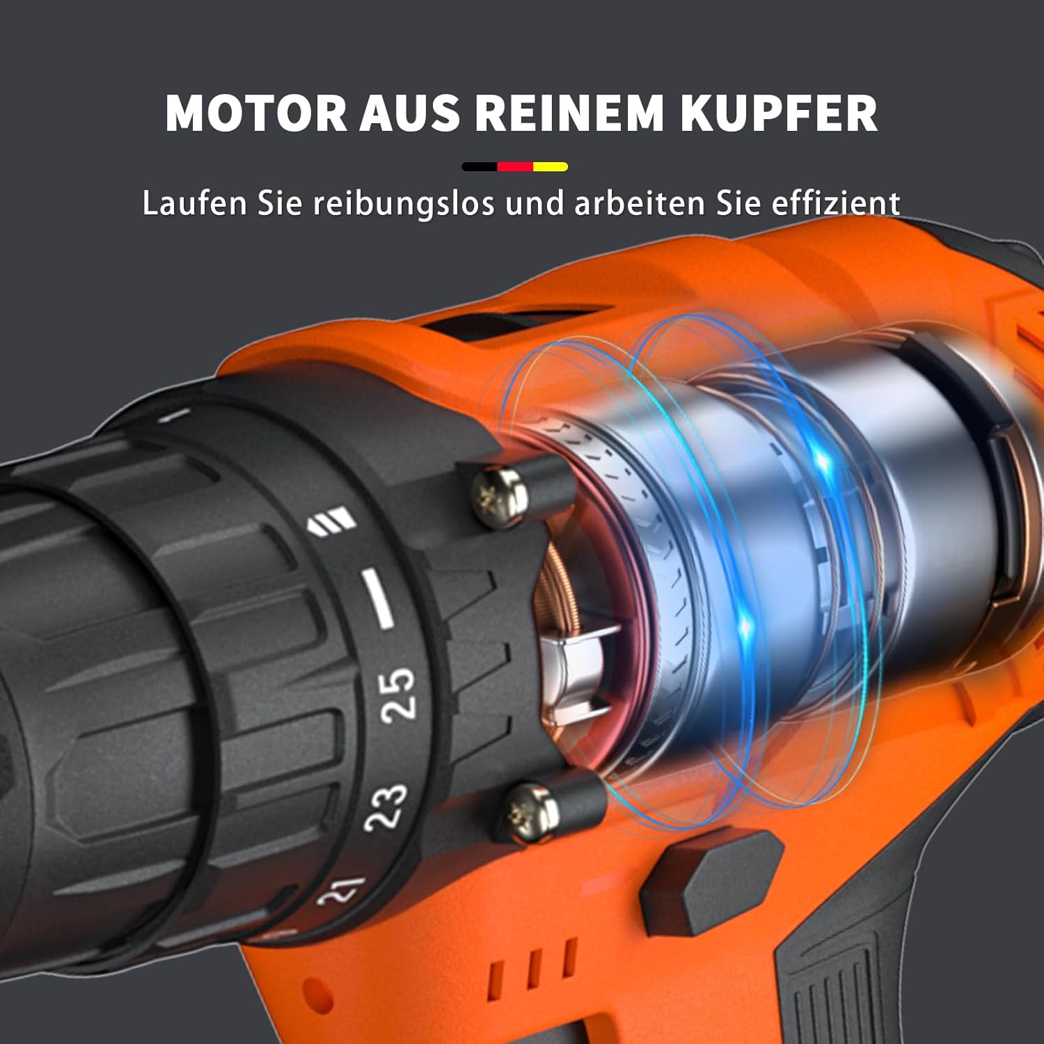 - 【Leistungsstarkes DIY-Bohrwerkzeug】- Der hochwertige motor sorgt dieser 21V Bohrschrauber stabil arbeitet, sie können mühelos Schrauben anziehen, Möbel montieren und Löcher in Holz oder Metall bohren. Ausgestattet mit einem leistungsstarken