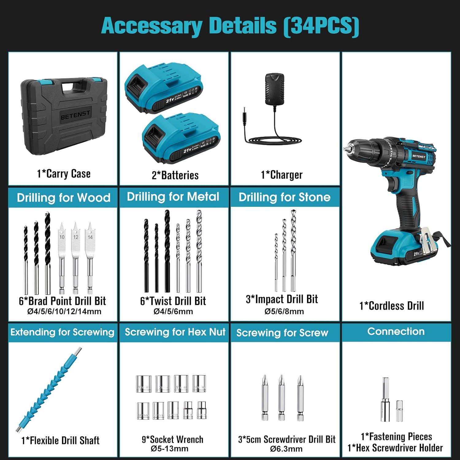 • 【30PCS Hochwertige Bohrer Zubehör Set】Wir bieten Ihnen 30pcs Bohrer Zubehör, das Akku-Bohrschrauber*1, einem 2,0-Ah-Lithium-Ionen-Akku*2, einem Ladegerät*1, einer Tragetasche*1 und einem Benutzerhandbuch*1 geliefert. Brad-Spitzenbohrer*6,