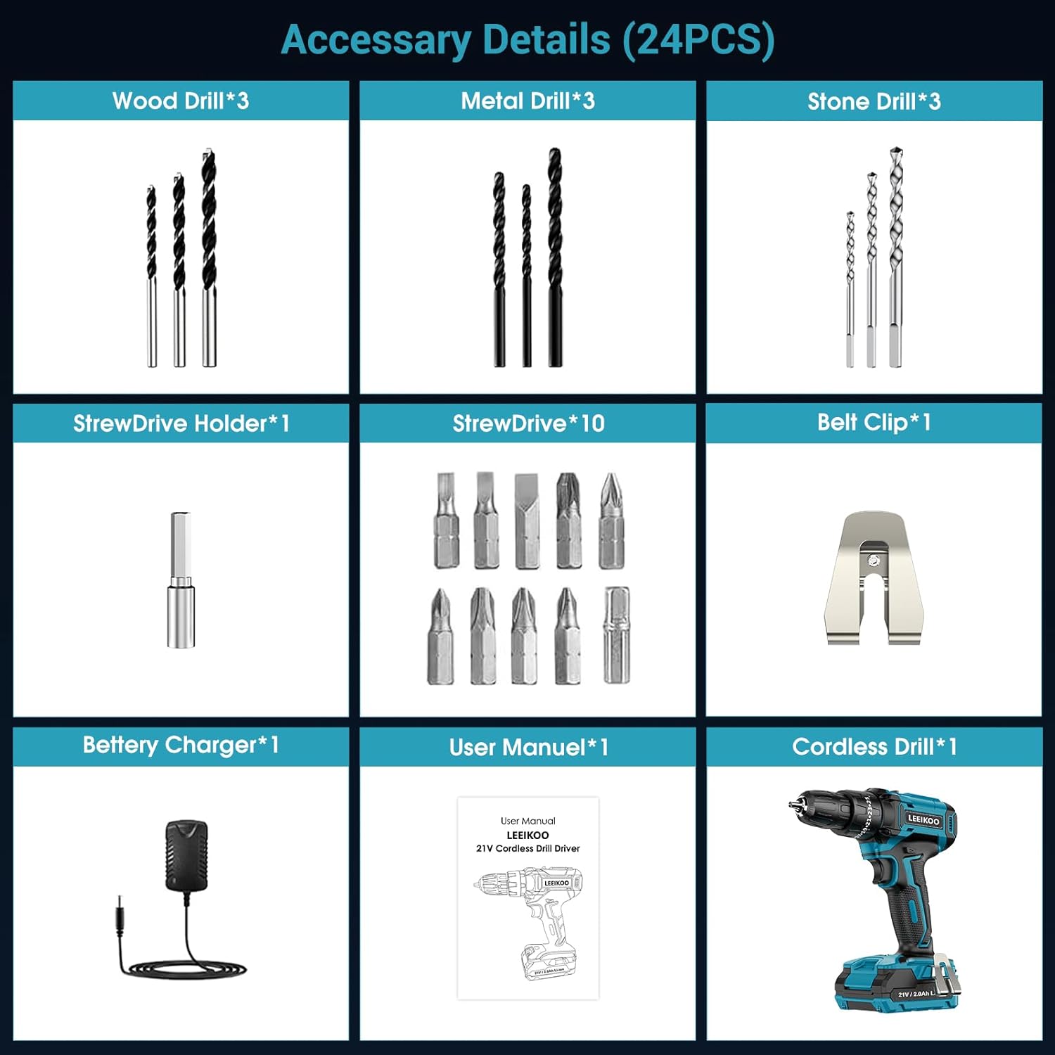 • 【24-teiliges Bohrer-Zubehör】Sie müssen nicht nach draussen gehen, um andere Bohrer zu kaufen, unser elektrisches Akku-Bohrschrauber-Set mit 24-teiligem Zubehör: 1 x 2000 mAh Lithium-Akku, 1 Schnellladegerät, 3 x HSS-Spiralbohrer, 3 x Brad