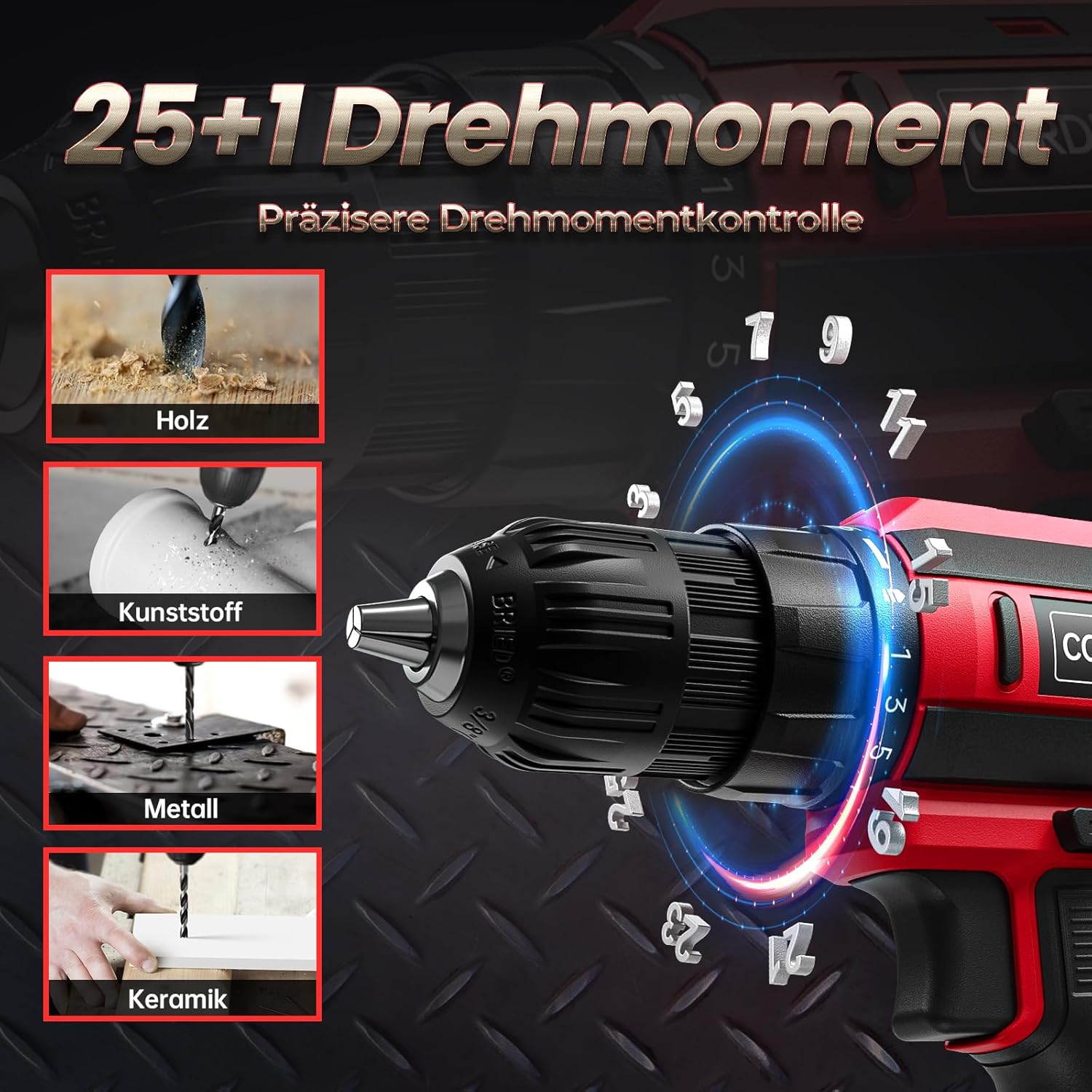 - 2 Gang & 25+1 Drehmoment Intelligente Kombination: 2 Geschwindigkeitsstufen, niedrige Geschwindigkeit (0-400 U/min) und hohe Geschwindigkeit (0-1600 U/min), machen den Akku-Bohrer in einer Vielzahl von Szenarien wie Holz, Keramik, Kunststoff, Metall und