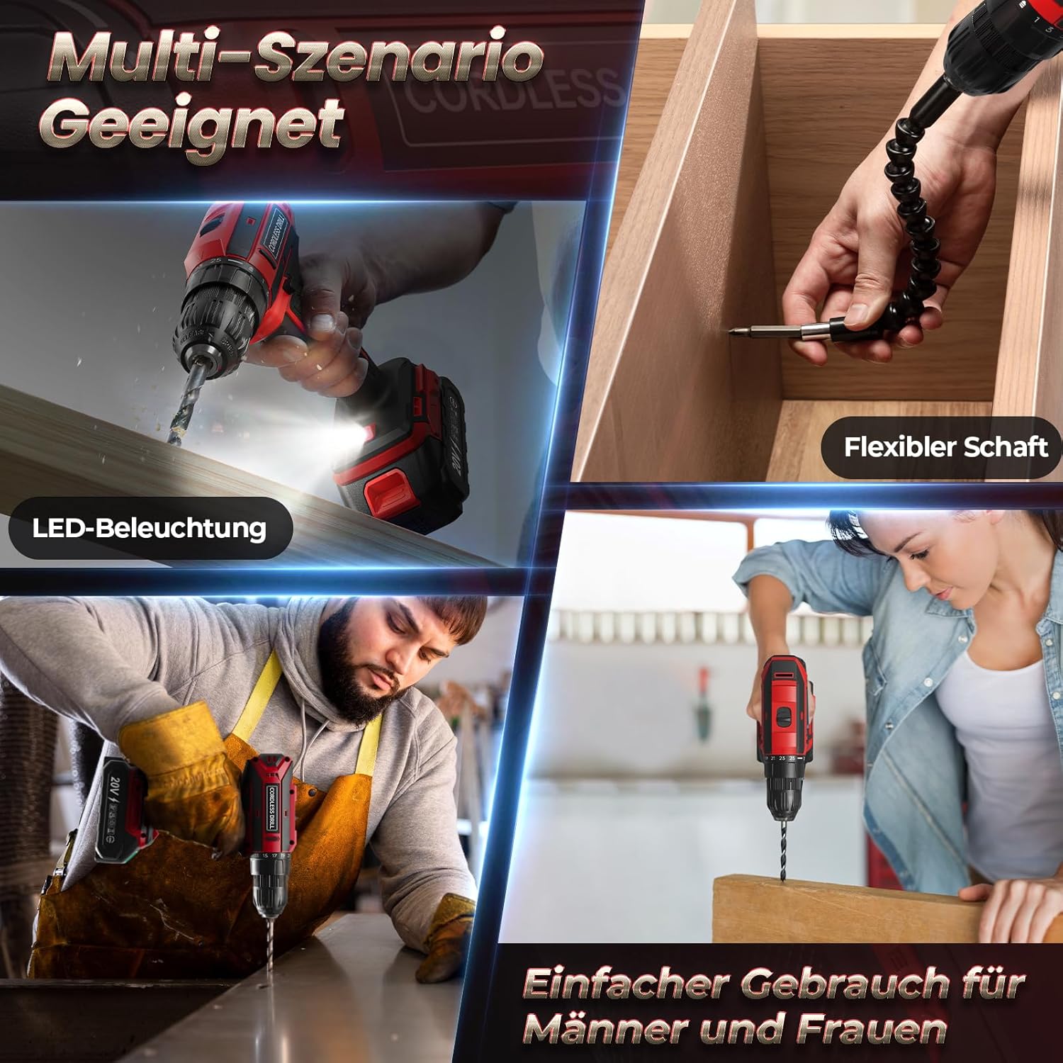 - 42NM-Kupfermotor: Der Akkuschrauber-Kit ist mit einer neuen, verbesserten Version des Kupfer-Doppellager-Getriebemotors mit einem maximalen Drehmoment von 42 NM ausgestattet.Der Hochleistungsmotor liefert eine starke, stabile Leistung und eine lange