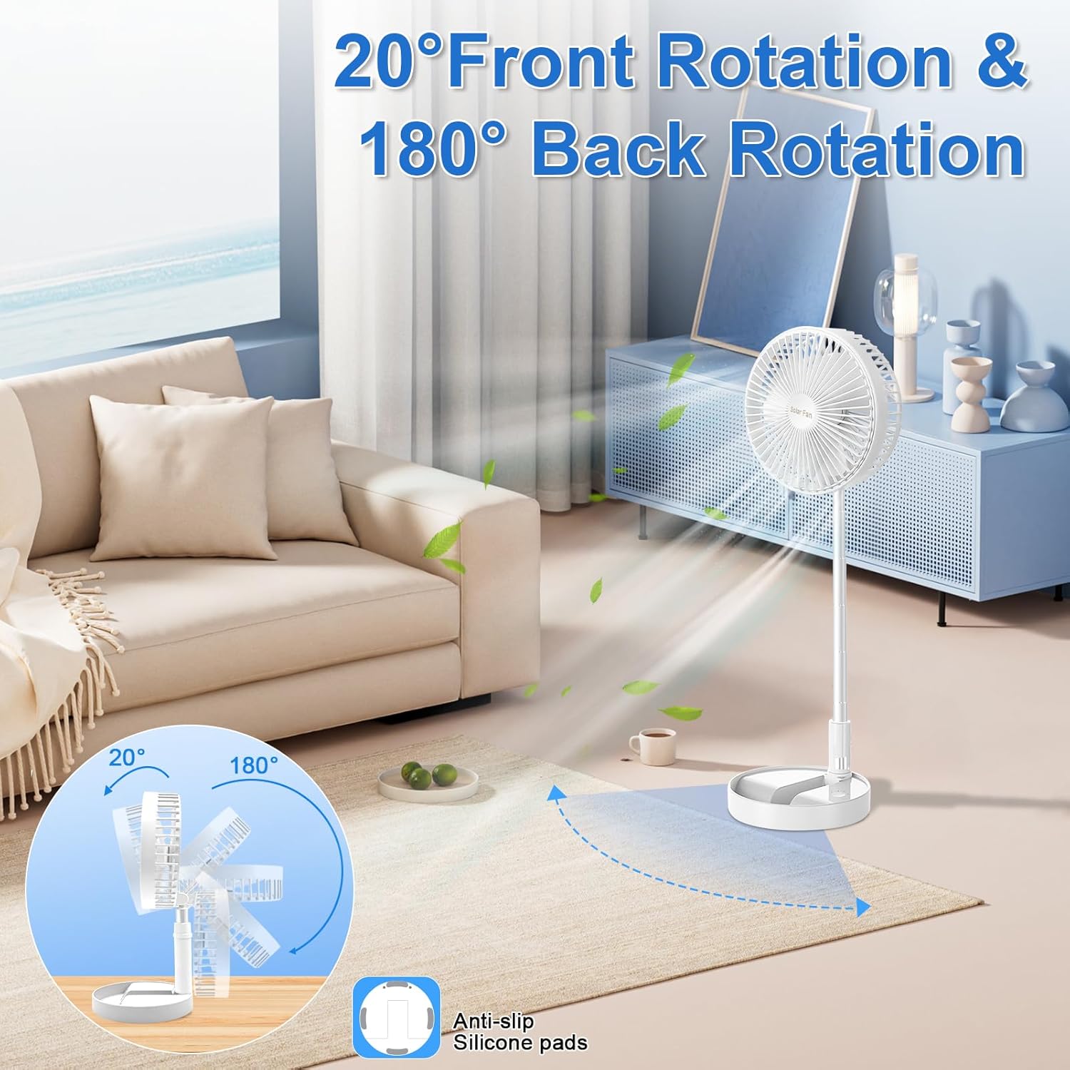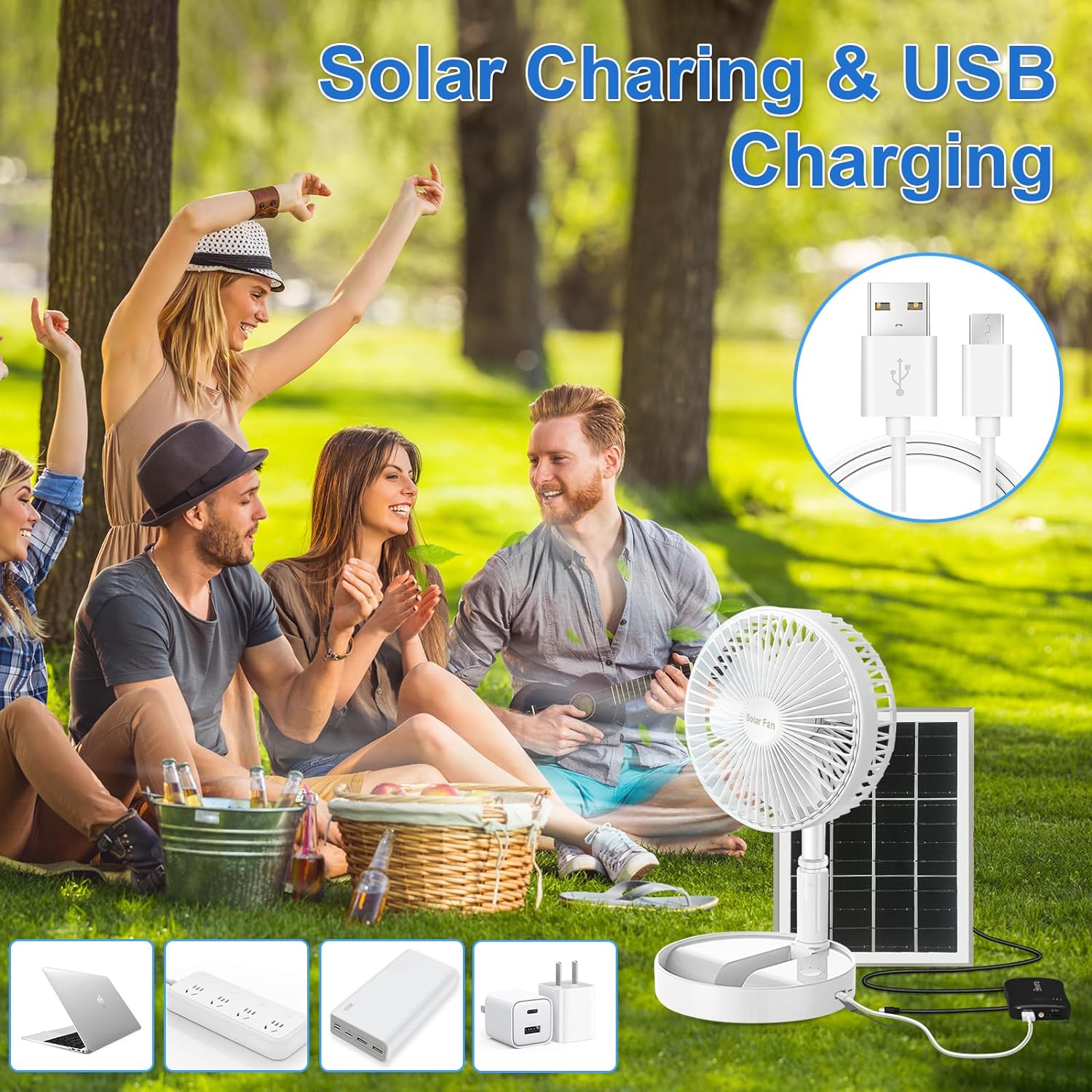 - 🍃【Solar- und Batteriebetriebener Ventilator】Dieser wiederaufladbare Standventilator kann entweder über ein Solarpanel oder ein USB-Kabel aufgeladen werden. Es nutzt Solarenergie zum Aufladen, wann immer es Sonnenlicht gibt, während ein USB-Kabel