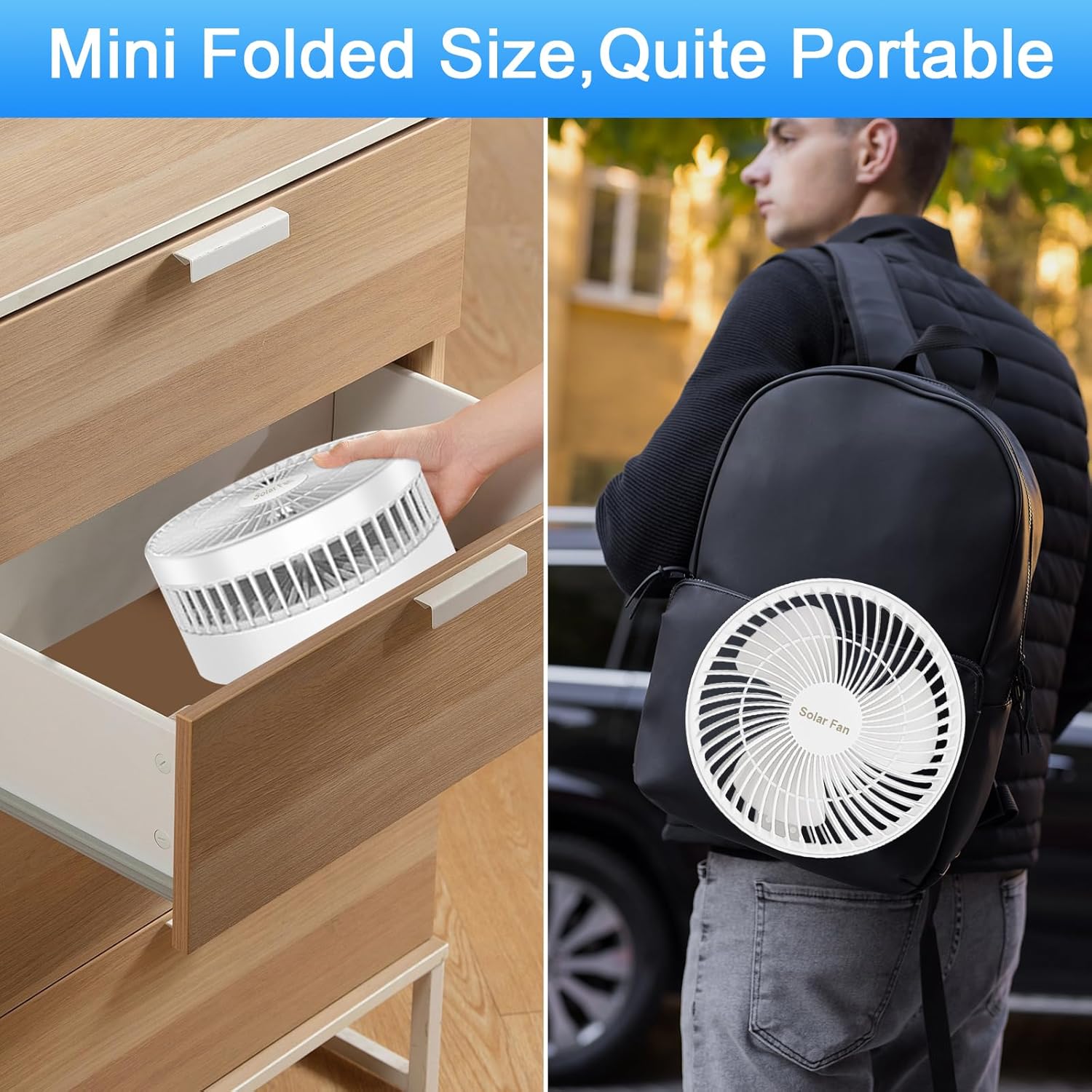 - 🍃【Multifunktional】Dieser wiederaufladbare Solarventilator verfügt über ein vielseitiges Design. Die Basis dient als kleine Aufbewahrungsbox oder praktische Handyhalterung. Darüber hinaus verfügt es über einen integrierten 5200-mAh-Akku, der