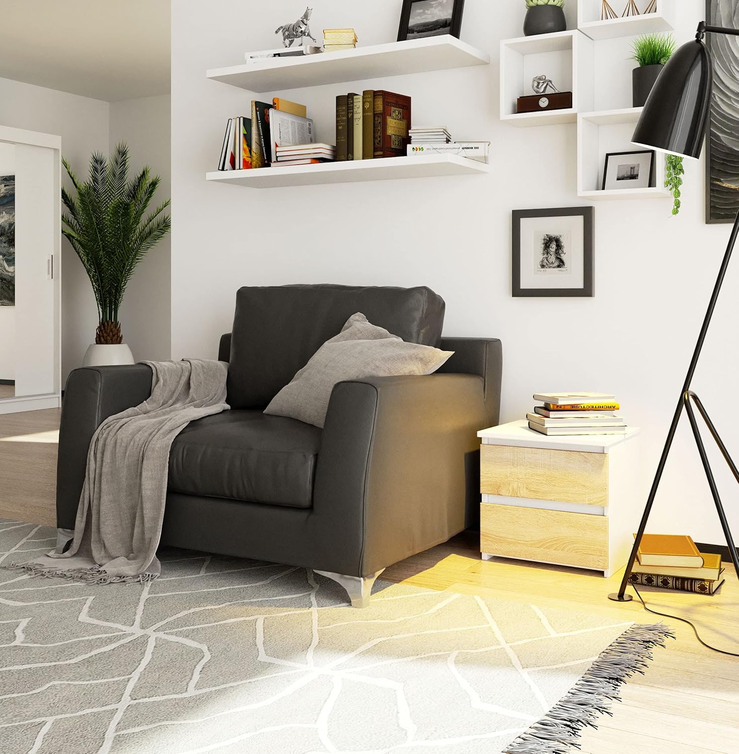 - Praktisch und vielseitig: Der Nachtisch ist eine praktische Aufbewahrung für kleine und schmale Schlafräume. Die grifffreien Schubfächer sind mit leichtgängigen Führungsschienen aus Metall ausgestattet.