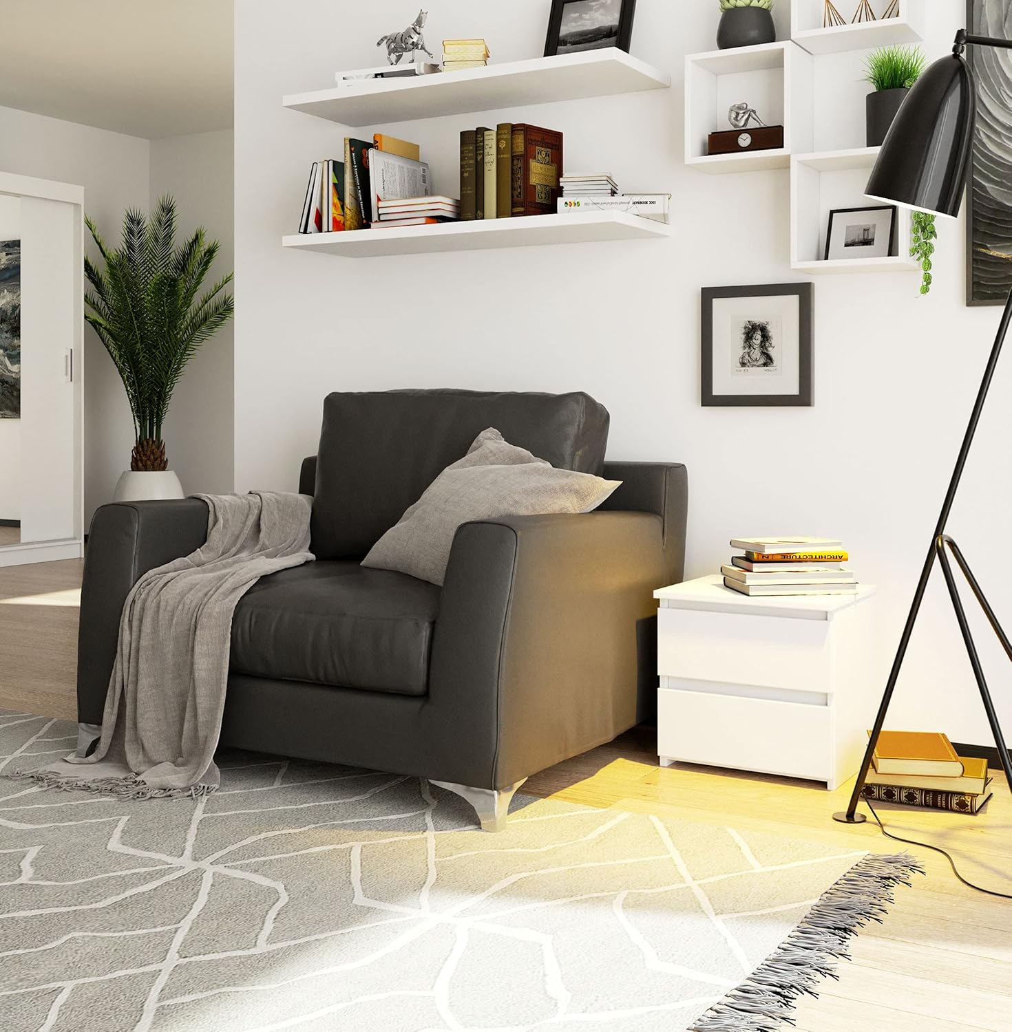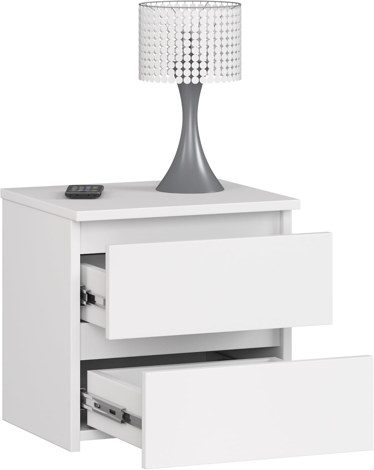 - Praktisch und vielseitig: Der Nachtisch ist eine praktische Aufbewahrung für kleine und schmale Schlafräume. Die grifffreien Schubfächer sind mit leichtgängigen Führungsschienen aus Metall ausgestattet.