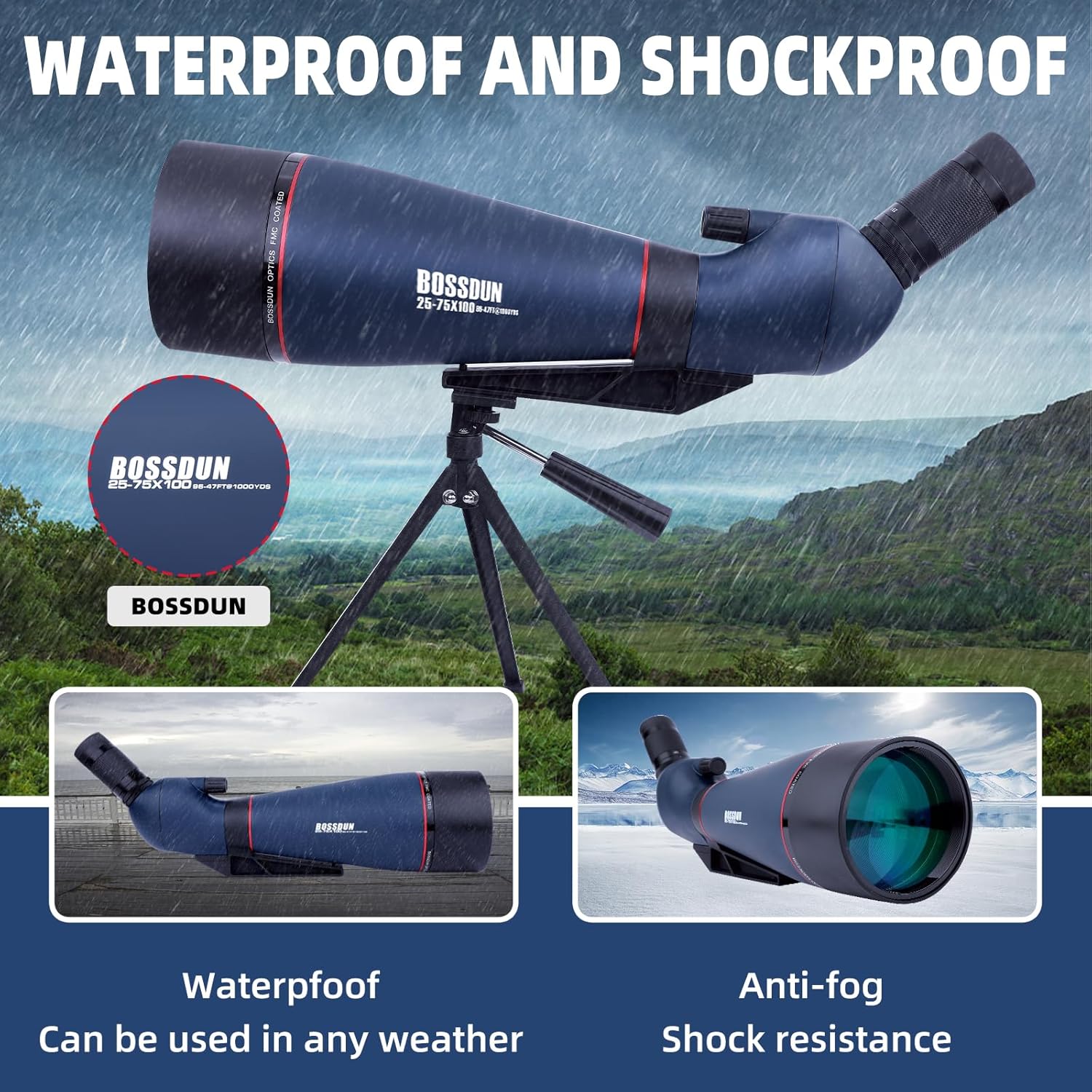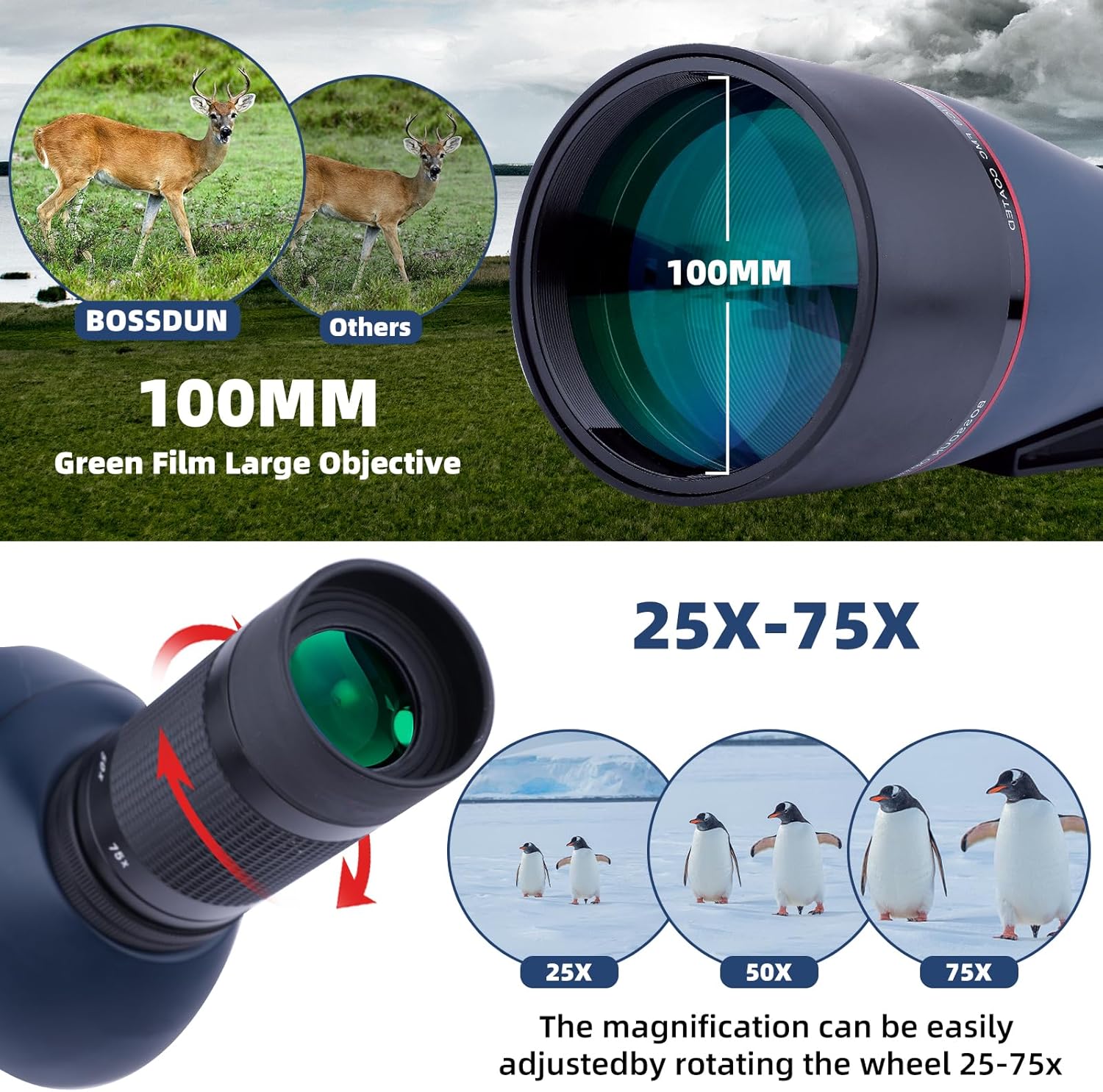 - 【Hohe Vergrösserung】 Mit einem leistungsstarken Zoombereich, der von 25 x bis 75 x eingestellt werden kann, bietet unser HD-Spektiv eine klare und helle Sicht auch bei 75-facher Vergrösserung, ohne Probleme mit chromatischer Aberration. Der