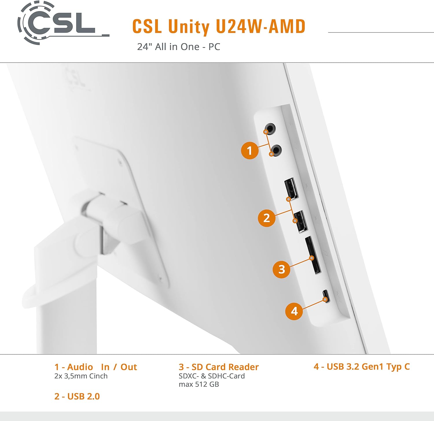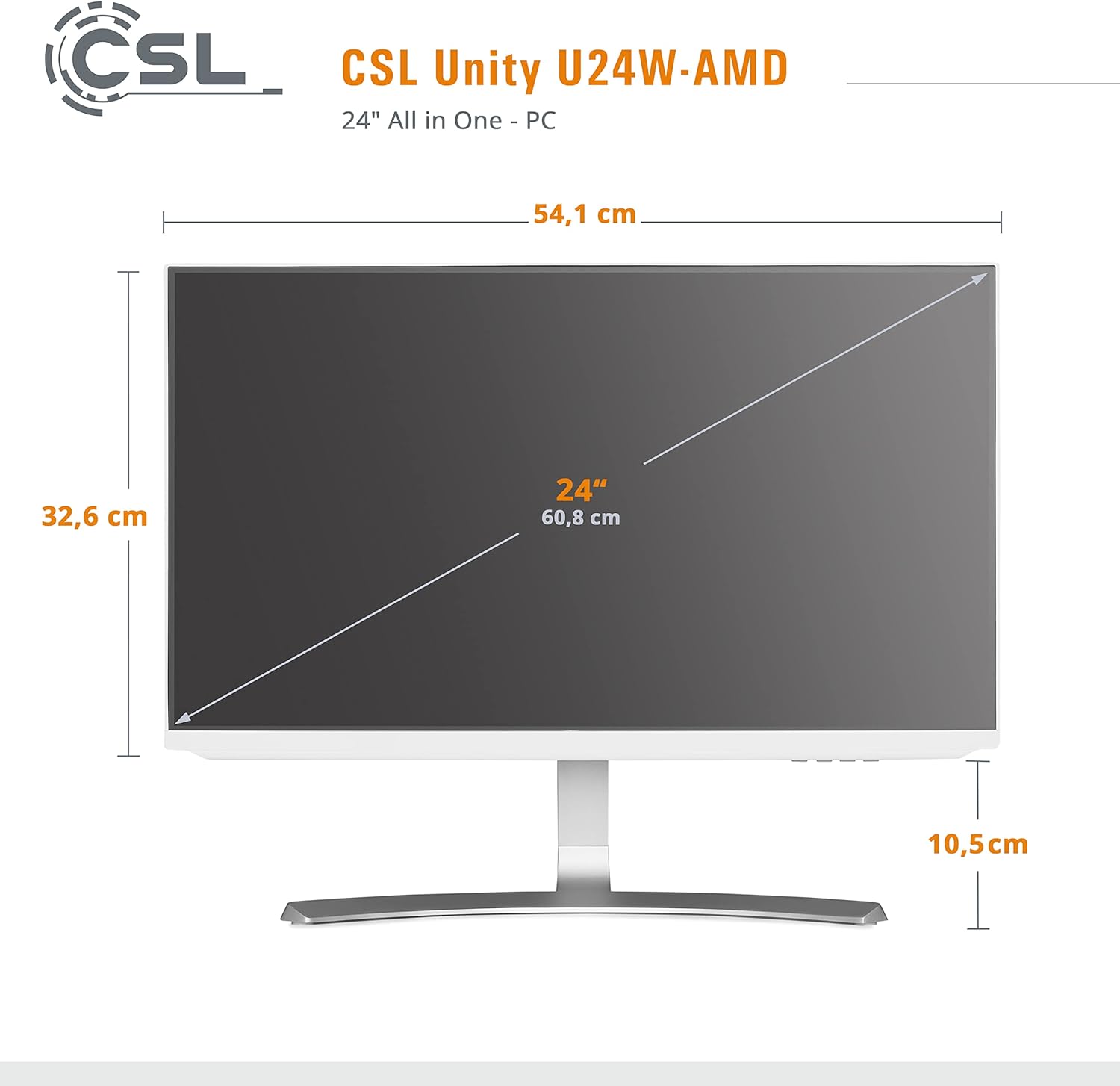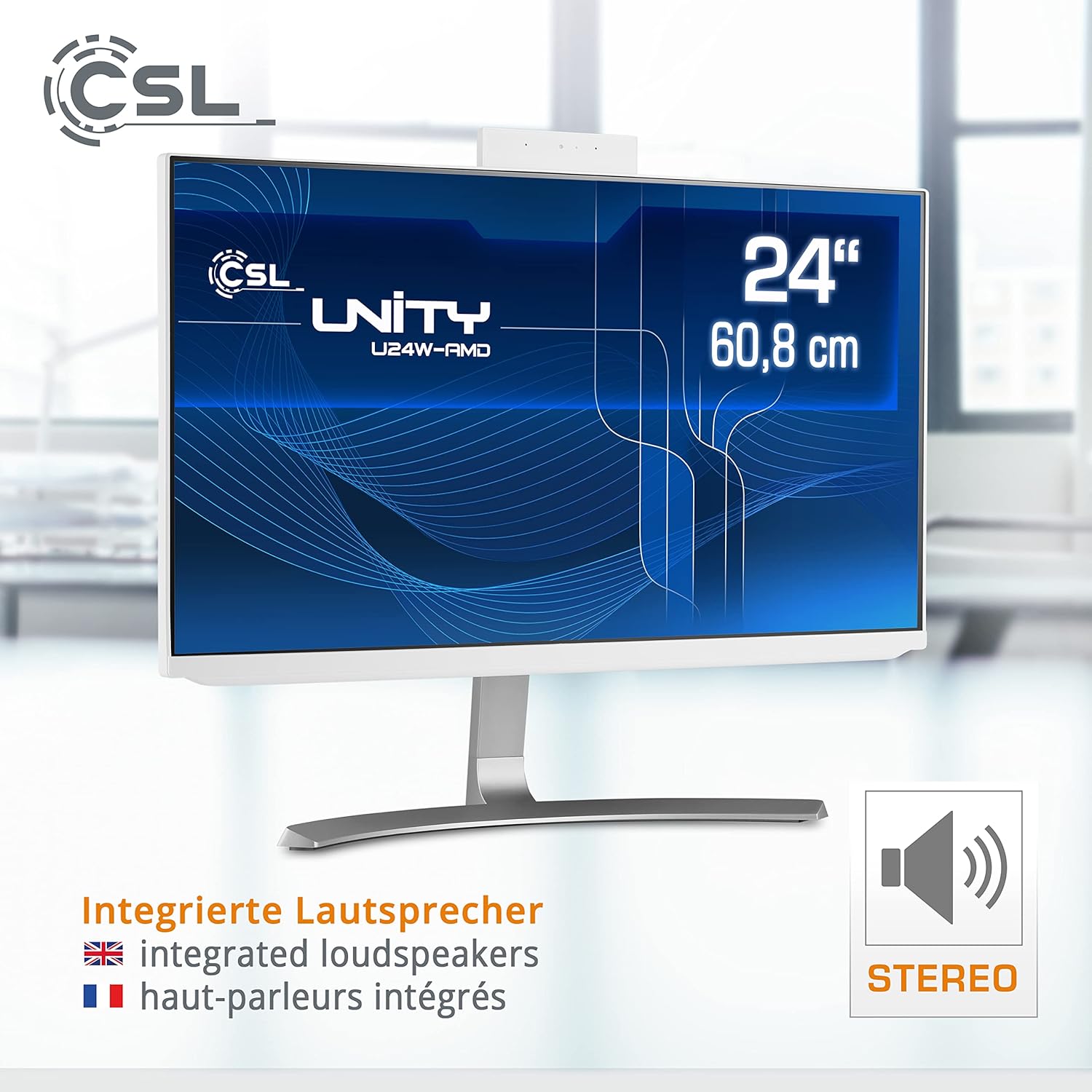 - Der CSL Unity U24W-AMD ist ein eleganter, leistungsstarker All-In-One Desktop-PC. Seine Ausstattung bietet eine starke Grundlage für alle gängigen Office-Anwendungen, hochauflösendes Media-Streaming und Casual Gaming. Die integrierte Webcam und das im