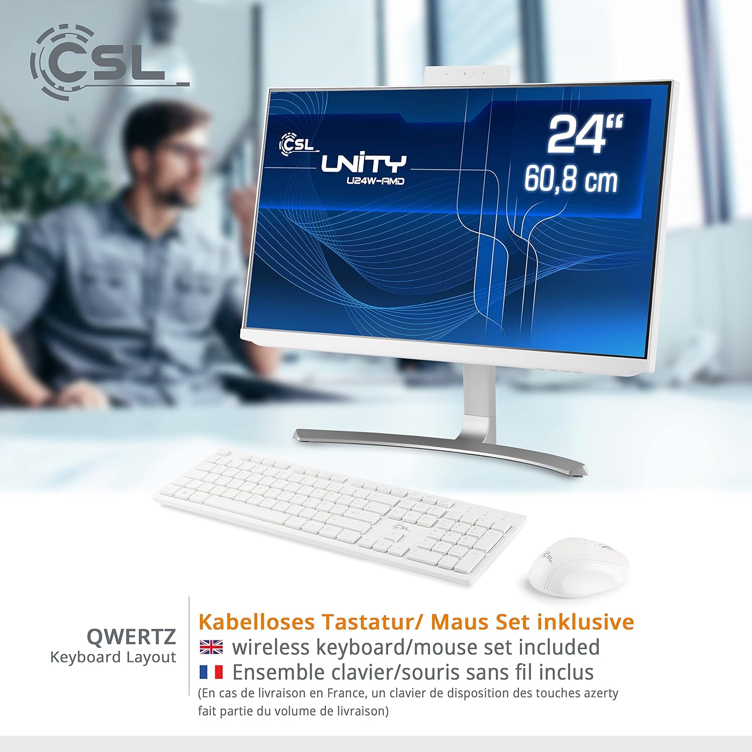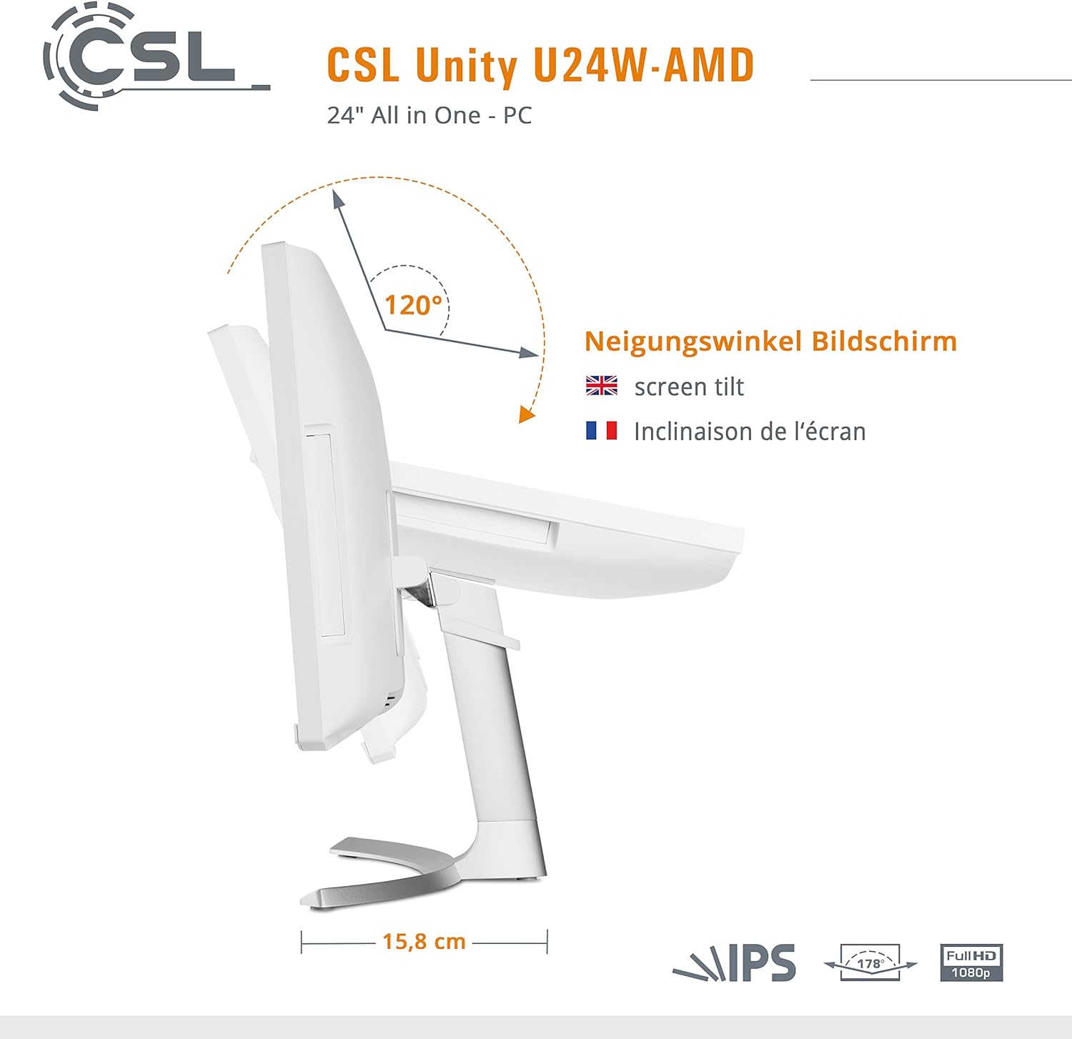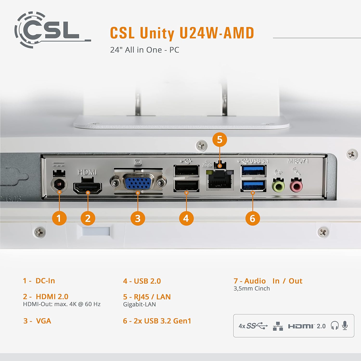 - Der CSL Unity U24W-AMD ist ein eleganter, leistungsstarker All-In-One Desktop-PC. Seine Ausstattung bietet eine starke Grundlage für alle gängigen Office-Anwendungen, hochauflösendes Media-Streaming und Casual Gaming. Die integrierte Webcam und das im