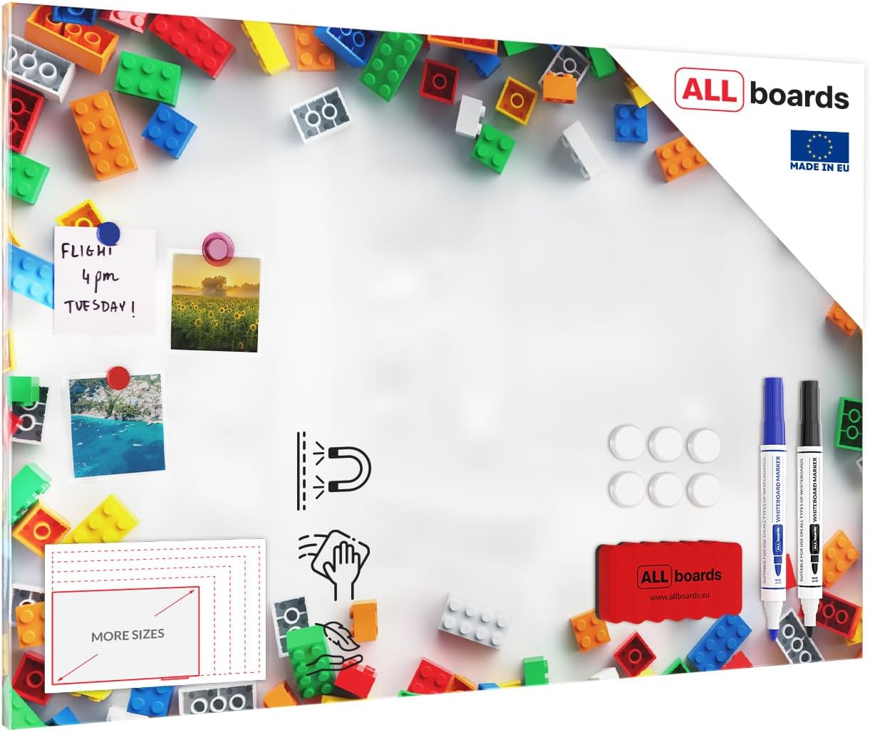 - EINFACHE MONTAGE – Die Tafel besitzt an jeder Ecke jeweils zwei Öffnungen, deren Durchmesser eine Montage mit Schrauben und Dübel ermöglicht. Die magnetische Tafel Metallboards kann sowohl horizontal als auch vertikal an der Wand angebracht werden.