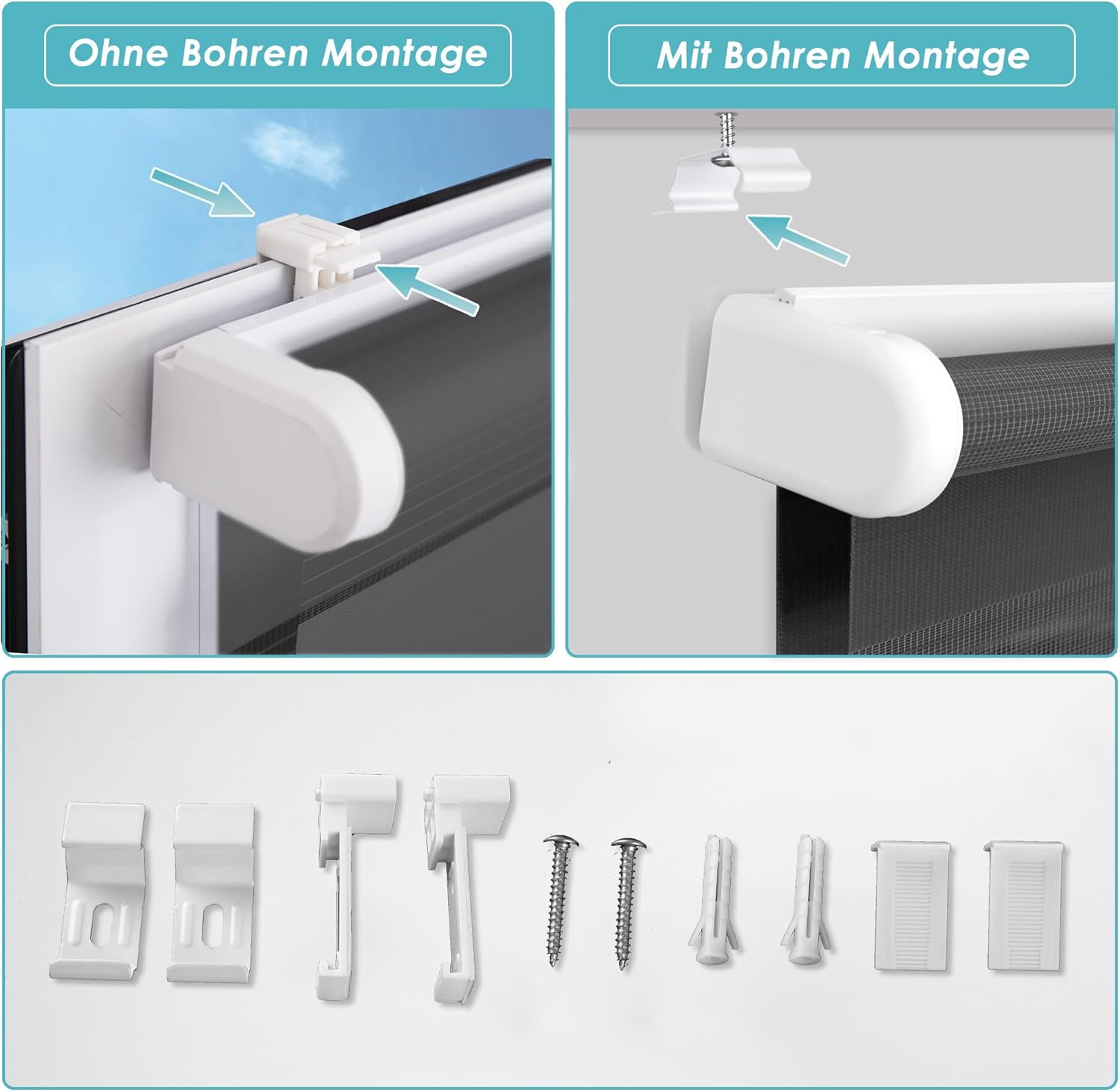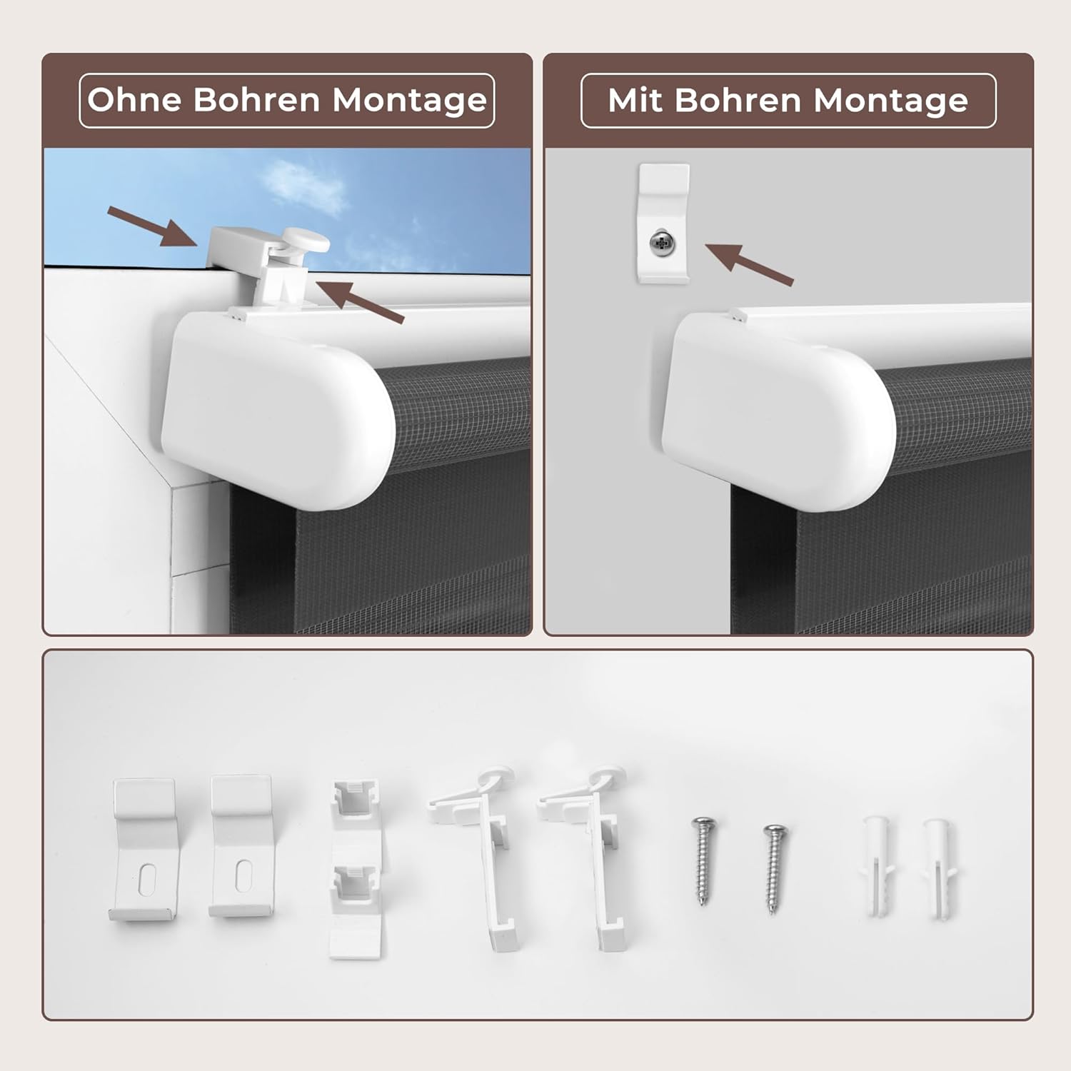 - ăMontage Rollo Ohne bohren & Mit Bohrenăâ¶. Ohne Bohren: Wegen seiner verstellbaren KlemmtrĂ€ger ist das komfortable Rollo ganz einfach am Fensterrahmen. â·. Mit Bohren: mit den mitgelieferten Schrauben an der Wand oder Decke befestigen. Die