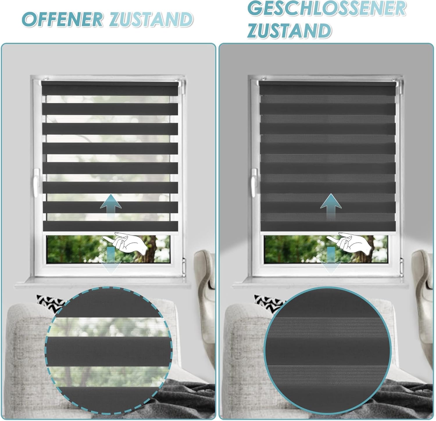 - đŁâ ïžăRollo Schnurlosă: Unsere Verbesserte Version Doppelrollo ist eine modernes, patentiertes Rollo-Antriebssystem, welches Sicherheit, Komfort und Ergonomie ohne den herkömmlichen Rollo-Seitenzug ermöglicht. Die Spannung der Feder im Rollo