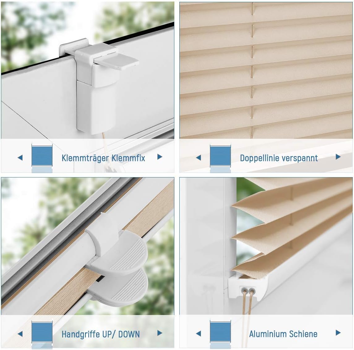 • Sichtschutz und Sonnenschutz: Die Allesin Klemm-Plissees lässt helle Tageslicht hindurch und ist gleichzeitig ein optimaler Sichtschutz und Blendschutz. Über die stufenlose Einstellung durch die an der Ober und Unterschiene angebrachten Griffe können