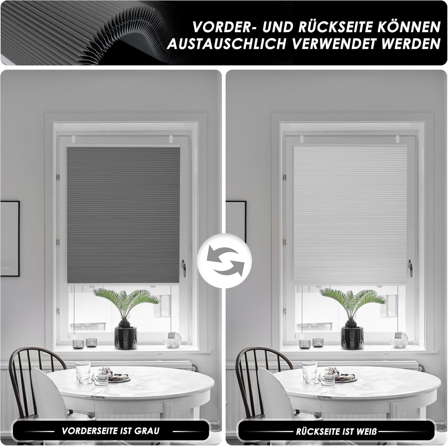 • Zweifarbig: Die Seiten des Plisseerollos Klemmfix haben unterschiedliche Farben, Material: 100% Polyester. Bei der Montage kann ausgewählt werden, welche Seite innen und welche aussen sein soll