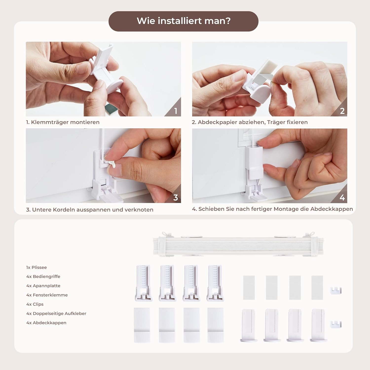 - โใ๐๐๐ข๐ง ๐๐จ๐ก๐ซ๐๐ง-๐๐ข๐ง๐๐๐๐ก ๐๐ฅ๐๐ฆ๐ฆ๐๐งใ: Sie kรถnnen den Wabenplissee Klemmfix mit Hilfe der vier mitgelieferten Klemmen am Fenster oder an der Tรผr befestigen. Die Klemmtrรคger