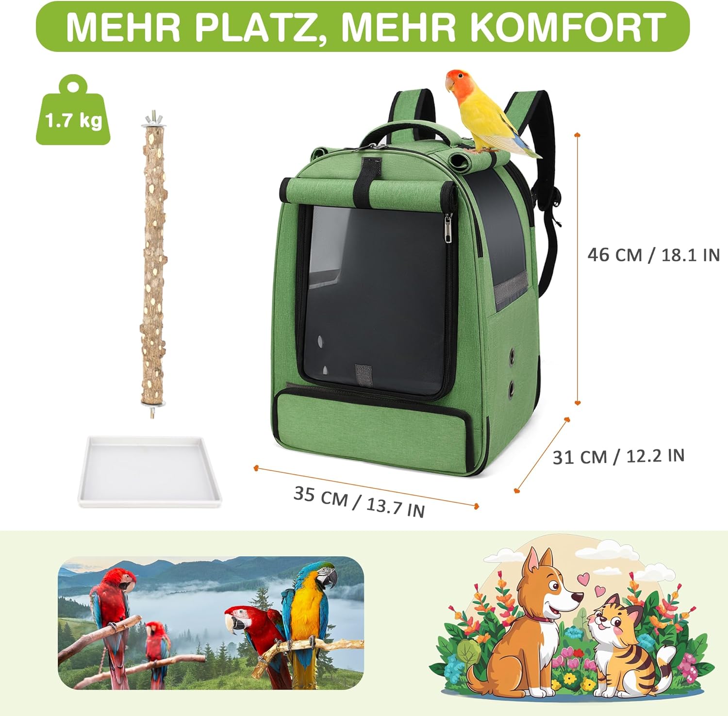 - Grösse: Der Vogelrucksack misst 35 x 31 x 46 cm. Das geräumige Design sorgt dafür, dass sich Ihr Vogel bequem im Rucksack entspannen kann. Es wird mit einem Tablett und einem Holzständer geliefert, der für zusätzlichen Komfort und Bequemlichkeit
