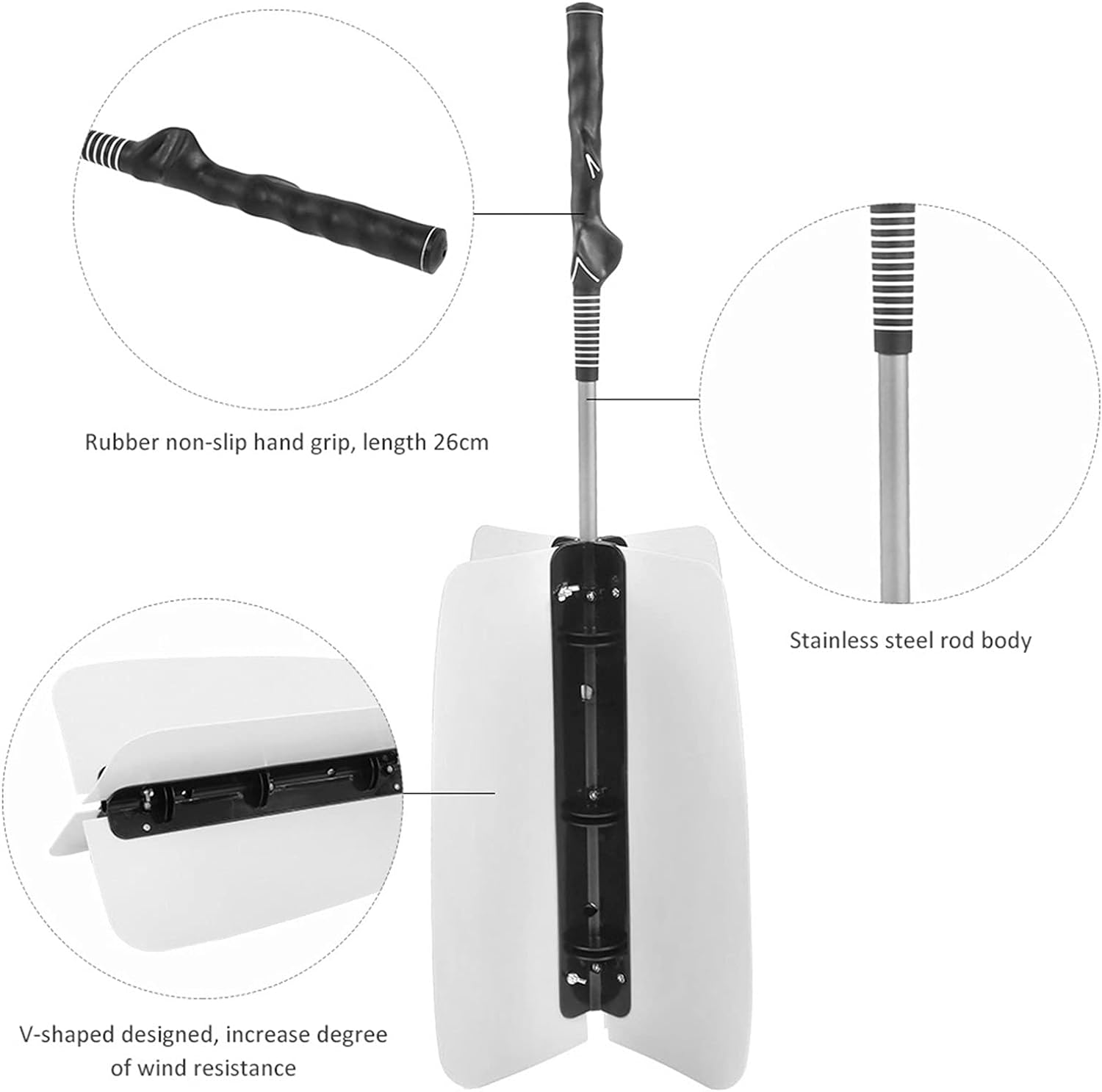 - GUMMI-Rutschfester HANDGRIFF: Dieser Golf-Fan-Trainer mit rutschfestem Gummihandgriff, Länge 26 cm, Stangenkörper aus Edelstahl, Hauptkörper bestehend aus 4 symmetrischen Lüfterflügeln, propellerförmigen Lüfterflügeln.