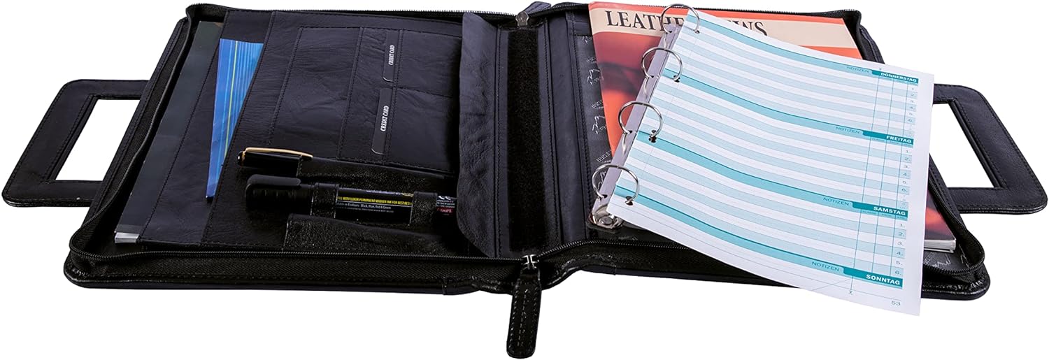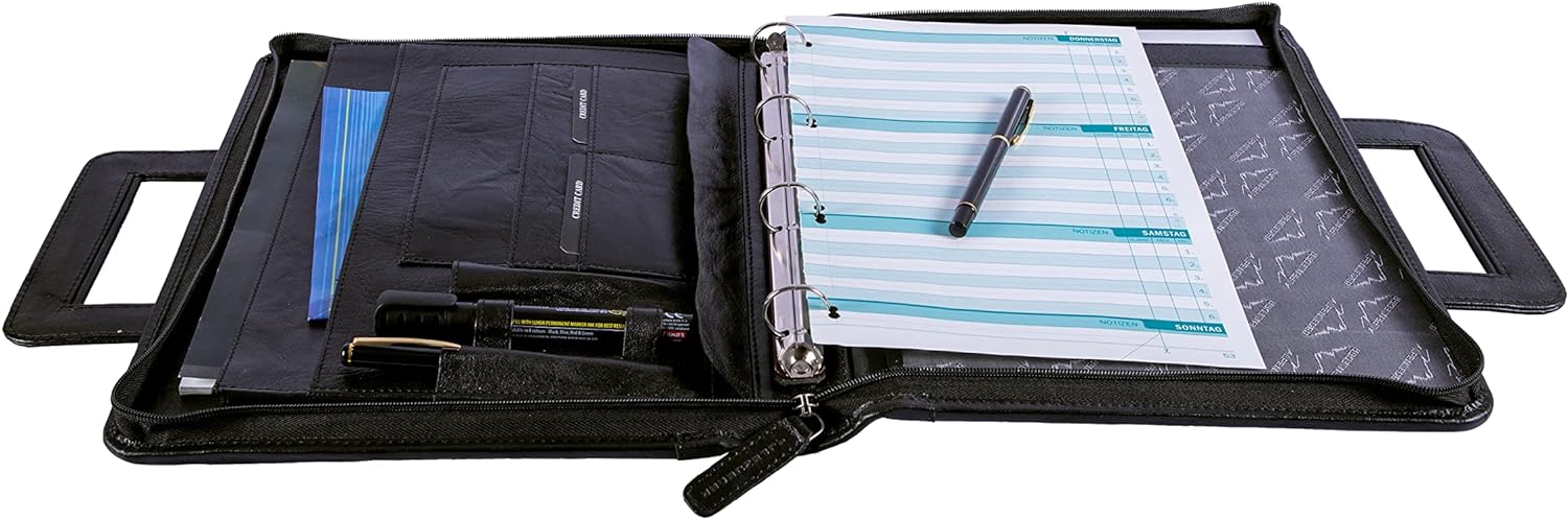 - STYLISCH UND PRAKTISCH – Unser unvergleichliche Konferenzmappe in zeitlosem Design besteht aus 100% vegetabilem vollnarbigem Leder, besitzt auf der linken Seite je 2 kleine und grosse Dokumentenfächer, 2 Kartenfächer sowie 3 Stiftehalter. Die mittige