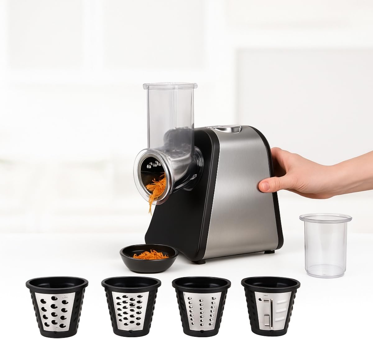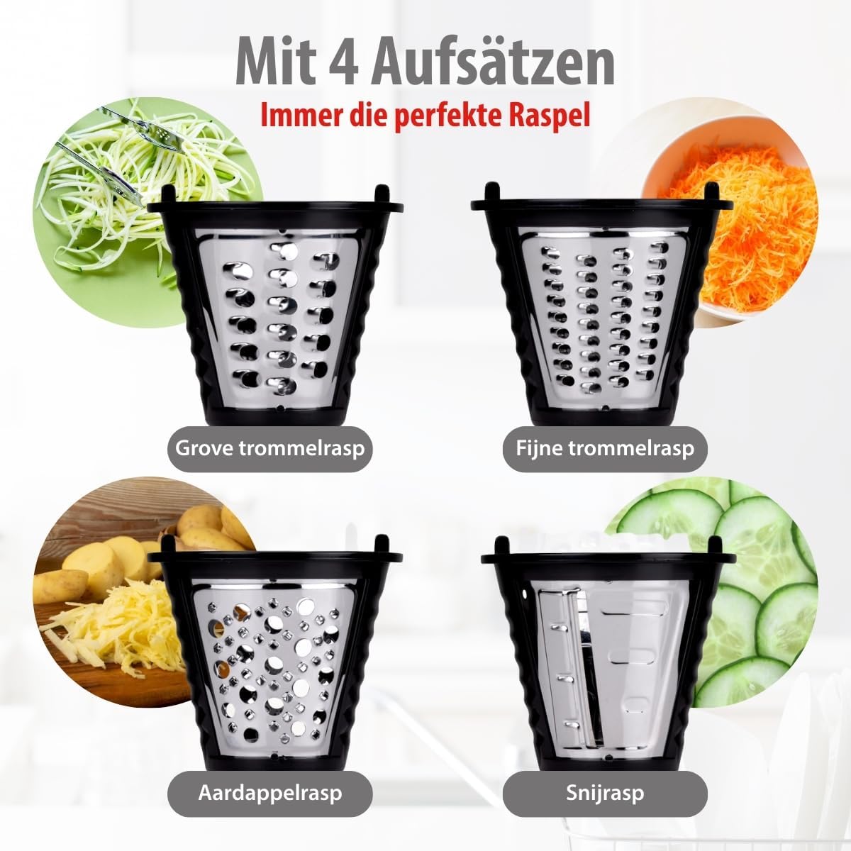 - ELEKTRISCHE REIBE MIT 4 KLINGEN - Der Gemüsezerkleinerer wird mit 4 Klingen geliefert, die für verschiedene Zwecke bestimmt sind: eine feine und grobe Schneidetrommel, eine Püriertrommel und eine Scheibentrommel.