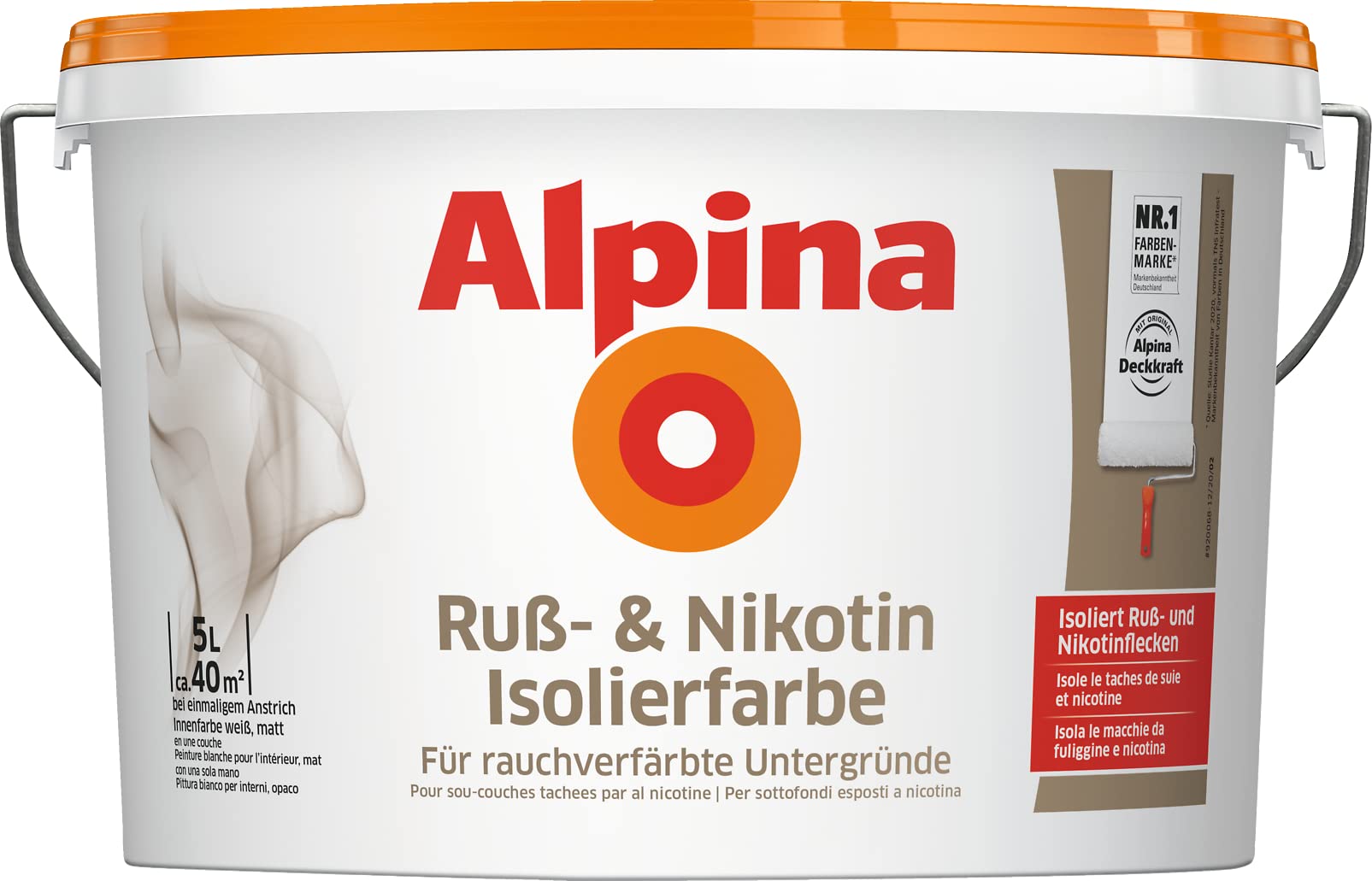 PRODUKTBESCHREIBUNGEN Die Isolierfarbe gegen Nikotinflecken. Geruchsfreundliche, wasserverdünnbare Innendispersionsfarbe für die schnelle Renovierung nikotinverfärbter Flächen. Umweltschonend, da emissionsarm - ausgezeichnet mit dem blauen Engel. Reichweite: ca. , 60 - , 70 , m2 Abtönen: Mit max. 10% Alpina Color abtönbar. Verbrauch ca. 125 ml/m2 pro Anstrich auf glatten Untergründen. Auf rauhen Flächen je nach Struktur entsprechend mehr. , , ,