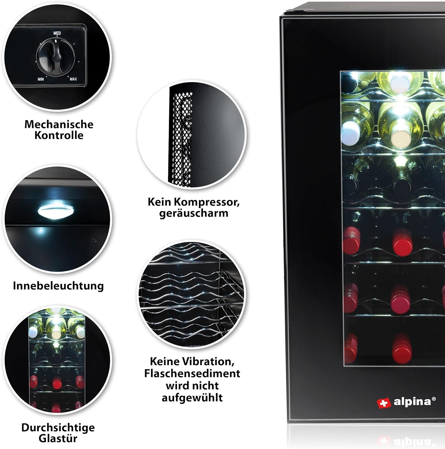 - GERINGER GERÄUSCH - Der alpina flaschenkühler hat kein Kompressor und ist geräuscharm. Ihr hat nur bewegliche Ventilatoren, die die Luft im Inneren des Weinkühlers umwälzen.