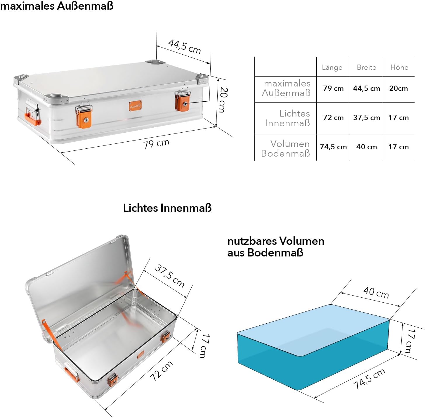 - Diese ALUBOX bietet ein Fassungsvermögen von 50 Litern mit den Aufstellmassen L 79 x B 44,5 x H 20 cm.