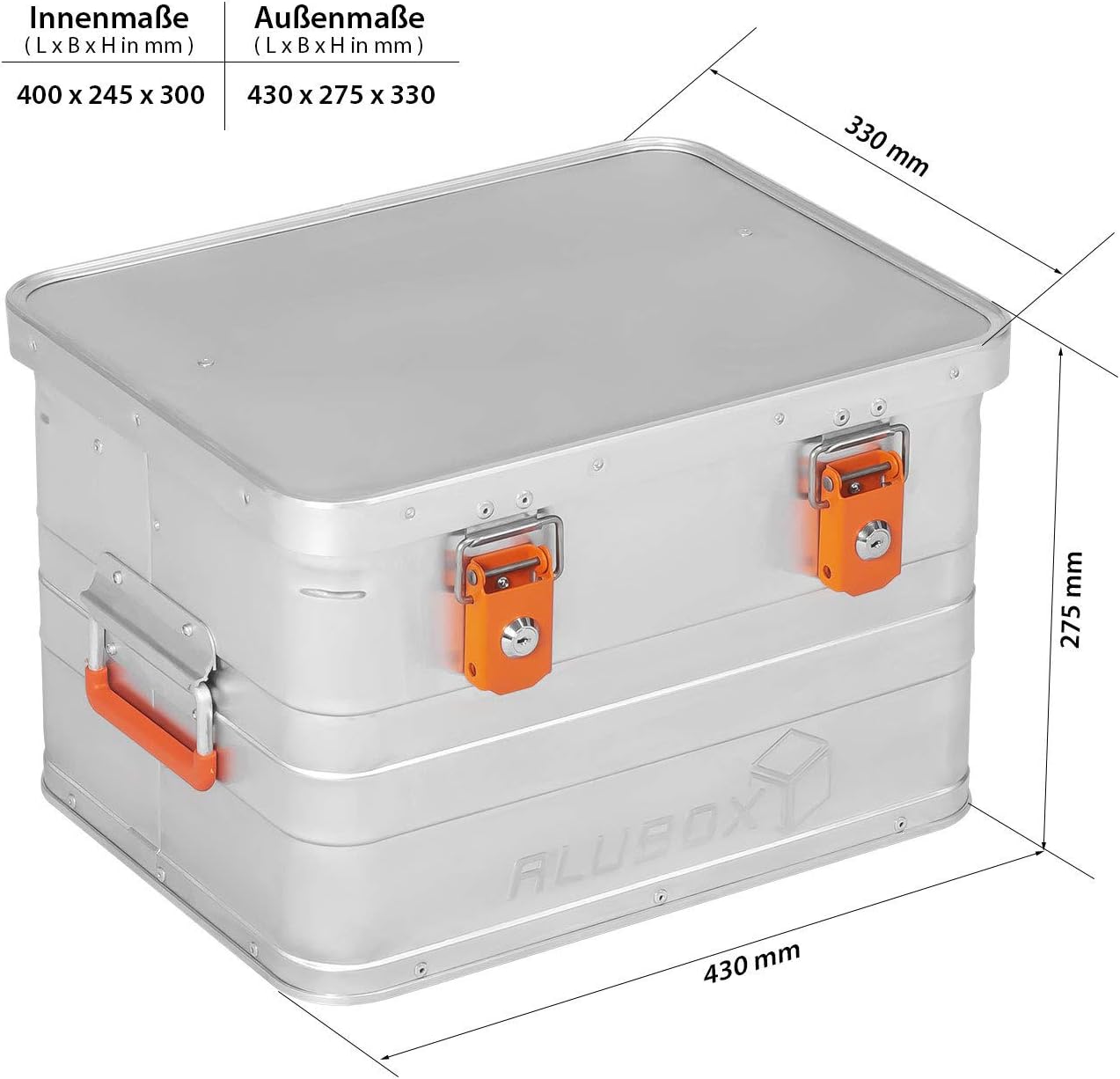 - Diese ALUBOX Kiste bietet ein Fassungsvermögen von 29 Liter mit den Aussenmassen L 43 x B 33 x H 27,5 cm
