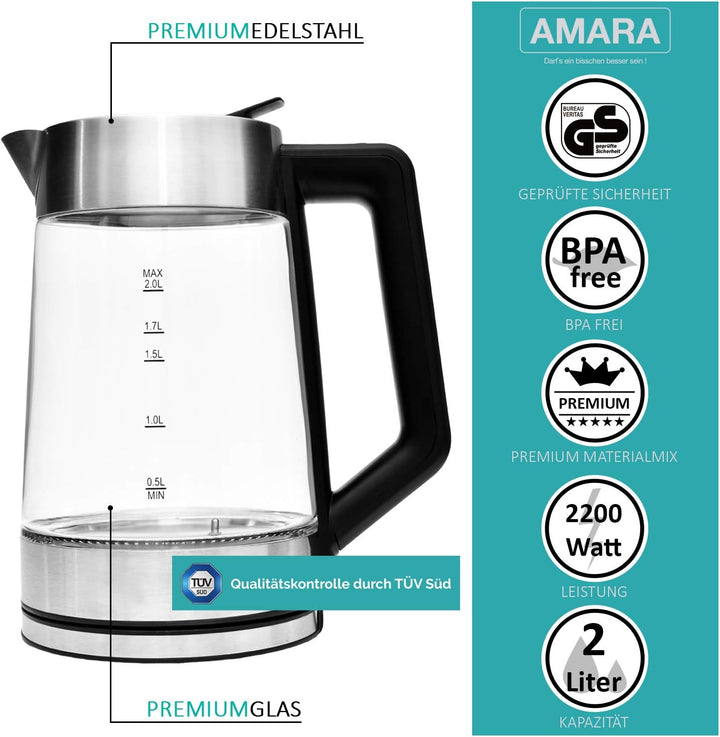 - KRATZFEST & MEHR STABILITÄT - Der Wasserkocher wurde aus kratzfestem Glas hergestellt und durch hochwertigen Edelstahl verbunden. Das Glas ist absolut hitzebeständig, auch über mehrere Stunden. Zusätzlich erhöht der integrierte und TÜV geprüfte Überhitzschutz die Sicherheit Ihrer Familie.