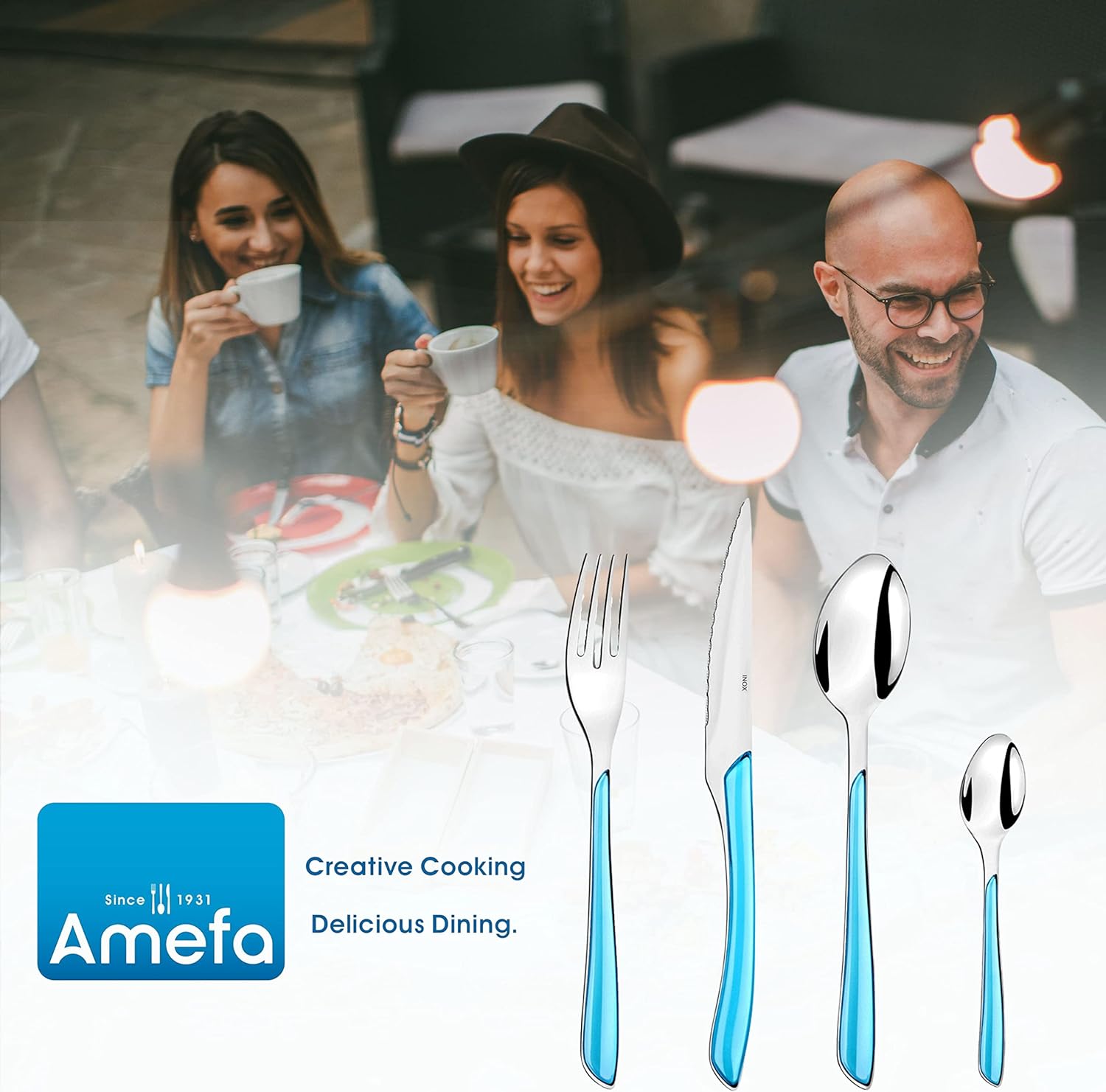 - INHALT: 24-teilig: 6 Menümesser, 6 Menügabeln, 6 Menülöffel, 6 Kaffeelöffel, 18/10 Edelstahl mit hochwertigen Kunststoffapplikationen, natürlich rostfrei