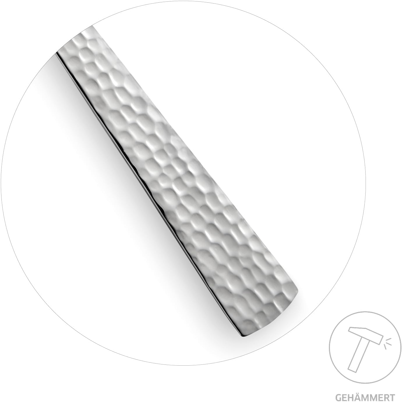- GEHÄMMERTER GRIFF. Das gehämmerte Muster betont die schlichte Kontur der Linie und bringt ein dezentes Funkeln auf Ihren Tisch.