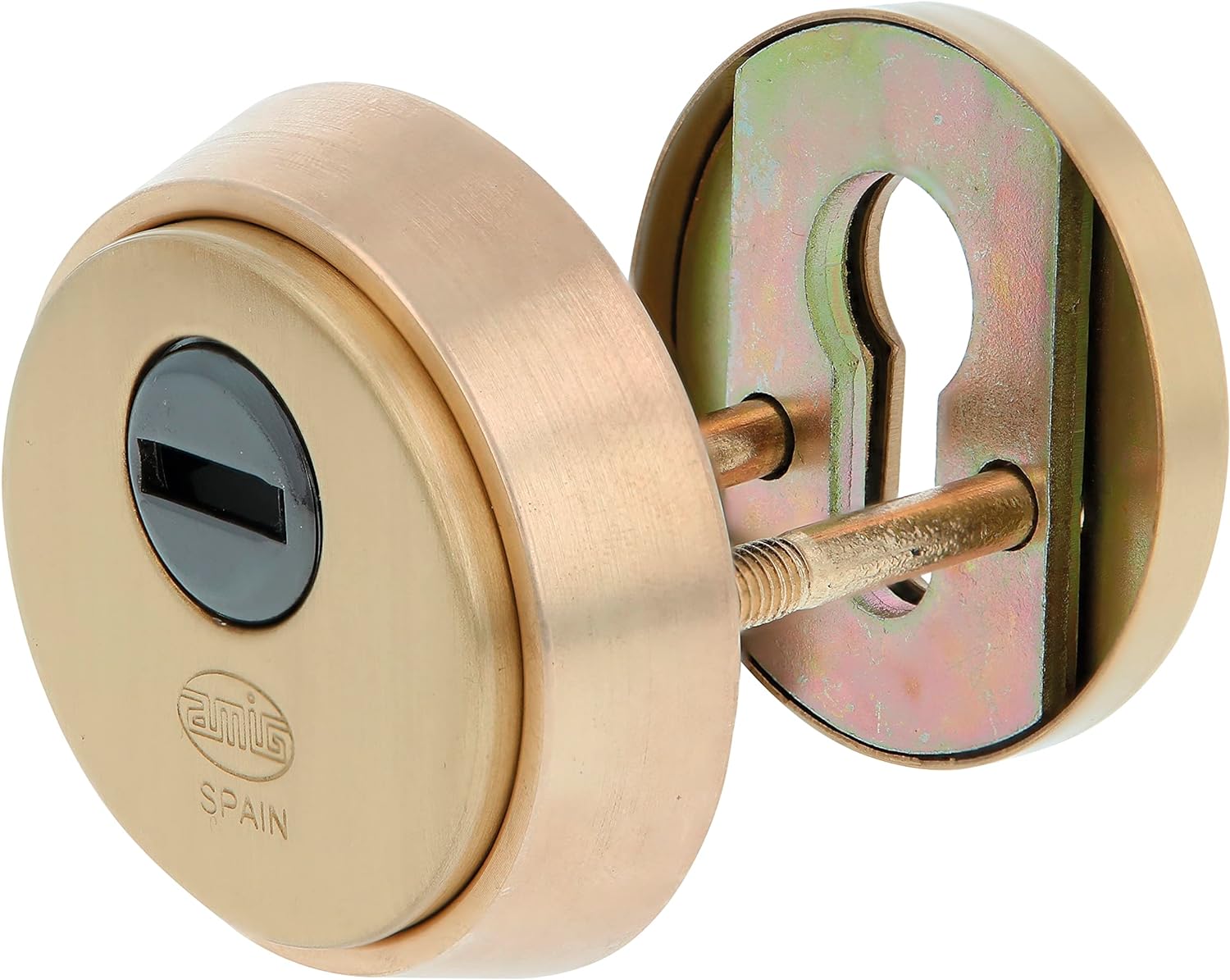 - DETAILS: für Türen mit einer Dicke von min. 40 mm. Das Messingschutzschild (Ø 65 mm) ragt 14 mm hoch. Schraubenlochabstand: 26 mm Inklusive Bohrschutzplatte, Hohlring, Öse und Schrauben.