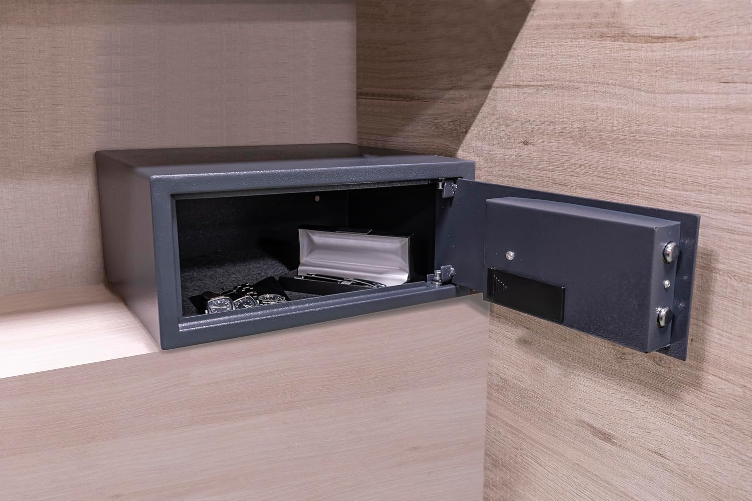 - Verwendung: Dieser Safe, einschliesslich Teppichboden und Wandbefestigungszubehör, hat genau die richtige Grösse, um einige Wertsachen wie Bargeld, Halsketten, Ringe und mehr aufzubewahren. Es ist für den Einsatz in Hotels, Wohnungen oder Büros