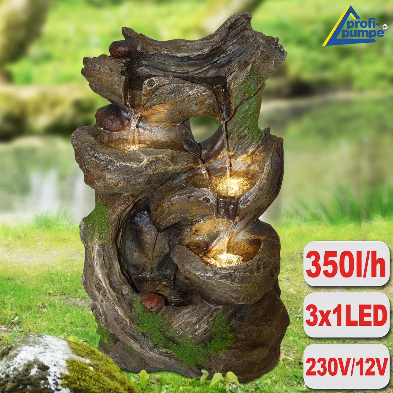 • Mit 230V/12V-Anschluss / Inkl. 7 Watt Pumpe / Inkl. LED-Ring in warmem Weiss