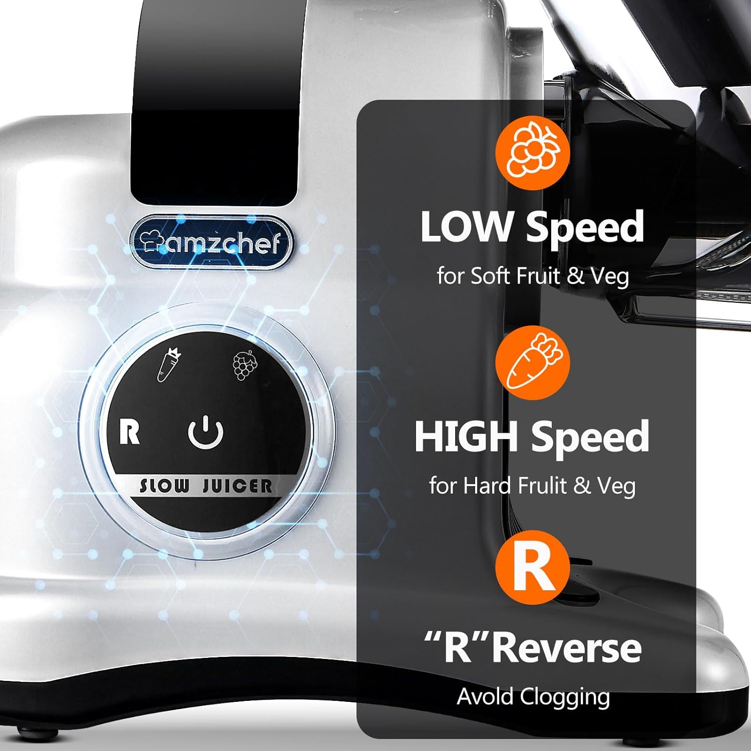 - ✔[2-Geschwindigkeiten & Umkehrmodus] - Mit 2 Geschwindigkeitsmodi und Umkehrfunktion ausgestattet, können Sie den weichen/harten Modus je nach Gemüse und Obst bei Ihrem AMZCHEF Entsafter einstellen. ★"SOFT MODE(50-60RPM)": Orange, citrus,