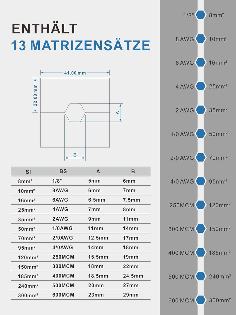 • 【VERDICKTER SCHIMMEL】 13 Sätze Crimpeinsätze aus Stahl (8-300 mm²: 8/10/16/25/35/50/70/95/120/150/185/240/300 mm²), die Vergrösserung der inneren Kolbenfläche macht die Kraft gleichmässiger und nicht leicht zu verformen . Der Crimpbereich von