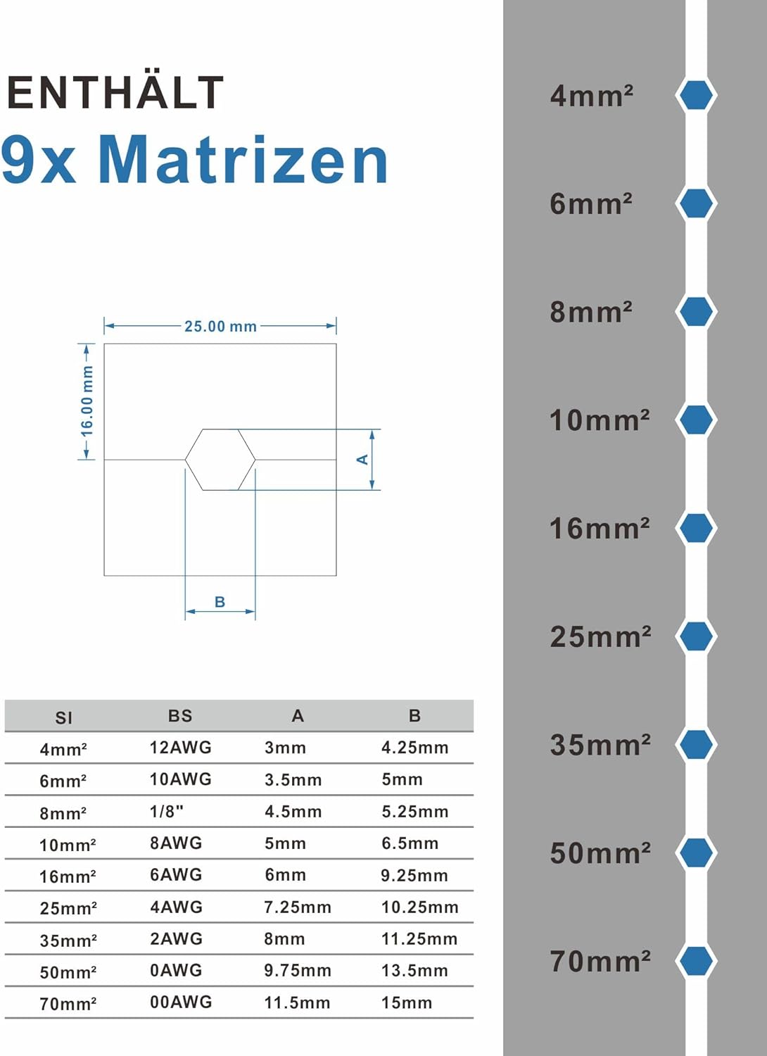 - 【VERDICKTER SCHIMMEL】 9 Sätze Crimpeinsätze aus Stahl (4-70 mm²: 4/6/8/10/16/25/35/50/70 mm²), die Vergrösserung der inneren Kolbenfläche macht die Kraft gleichmässiger und nicht leicht zu verformen . Der Crimpbereich von Kupferkabelschuhen: 4-70 mm²; Der Crimpbereich von Aluminiumkabelschuhen: 4-50 mm².