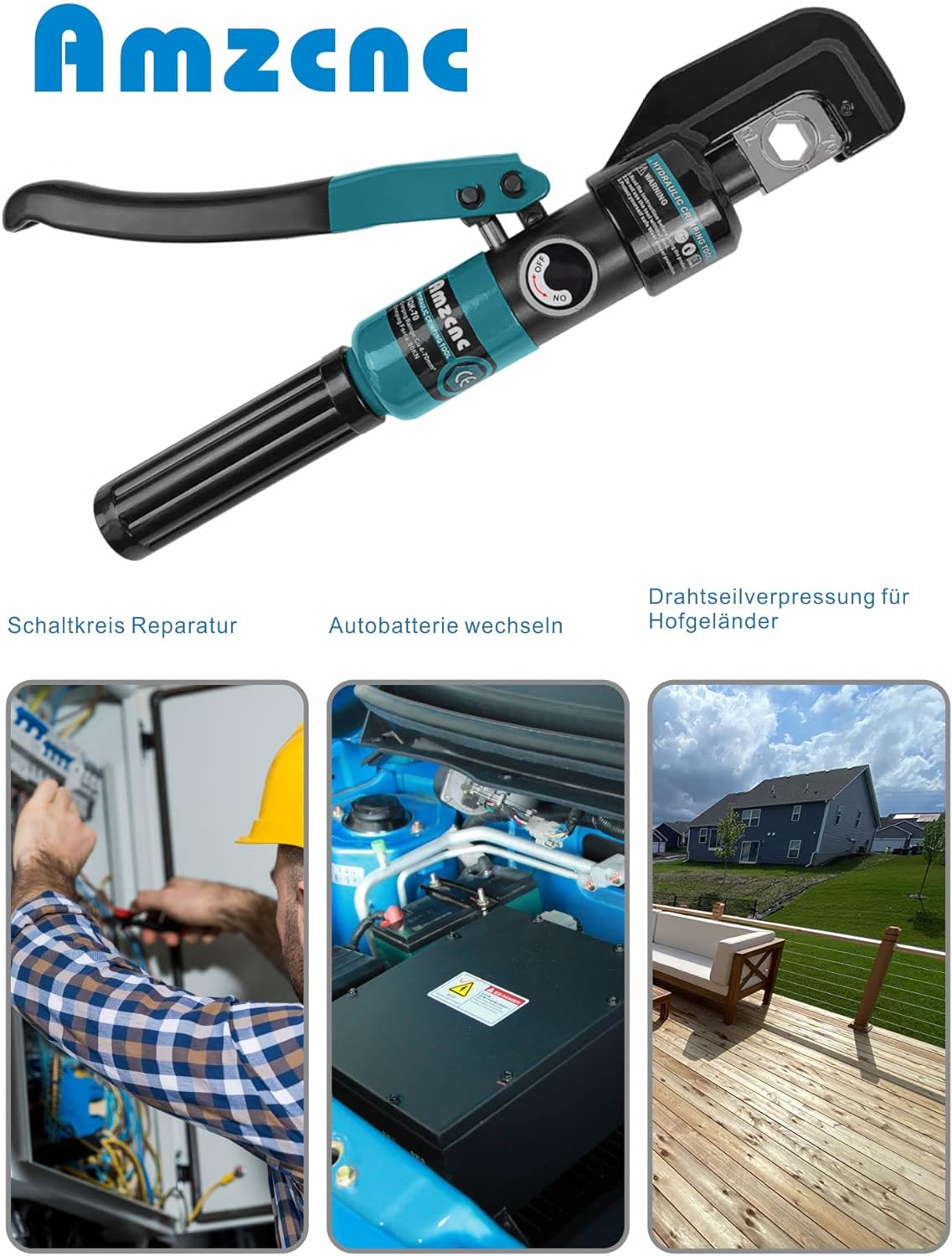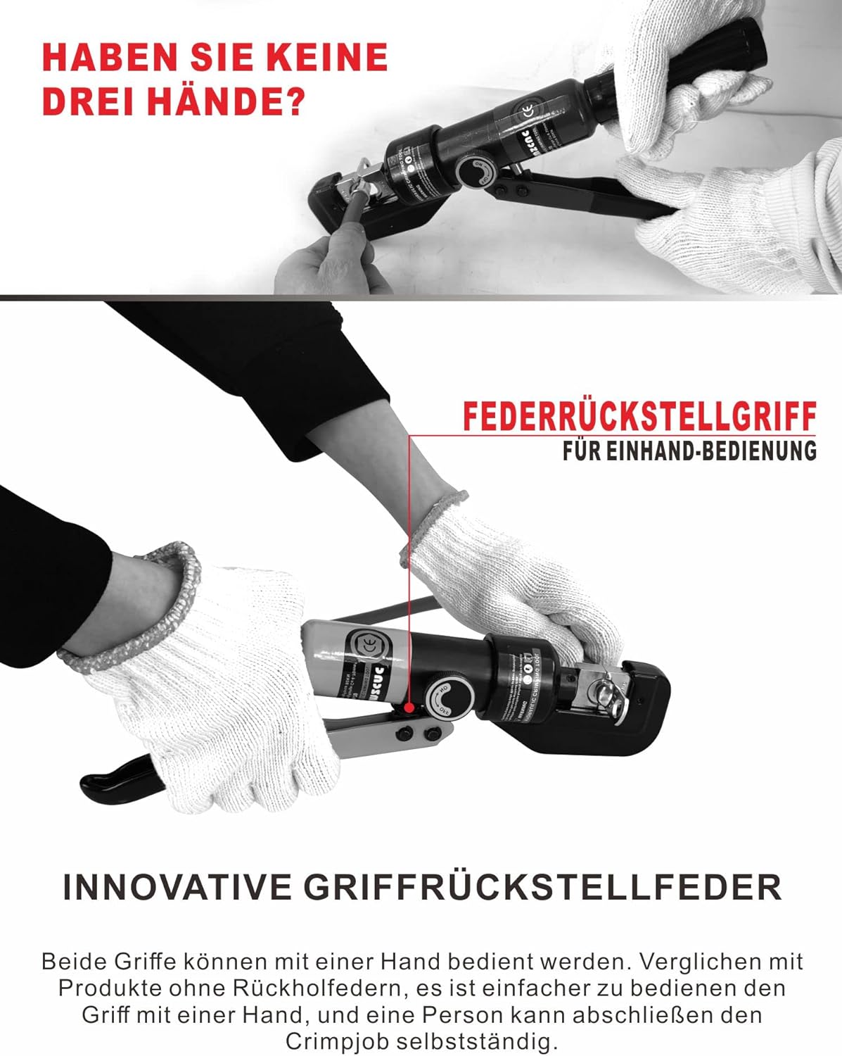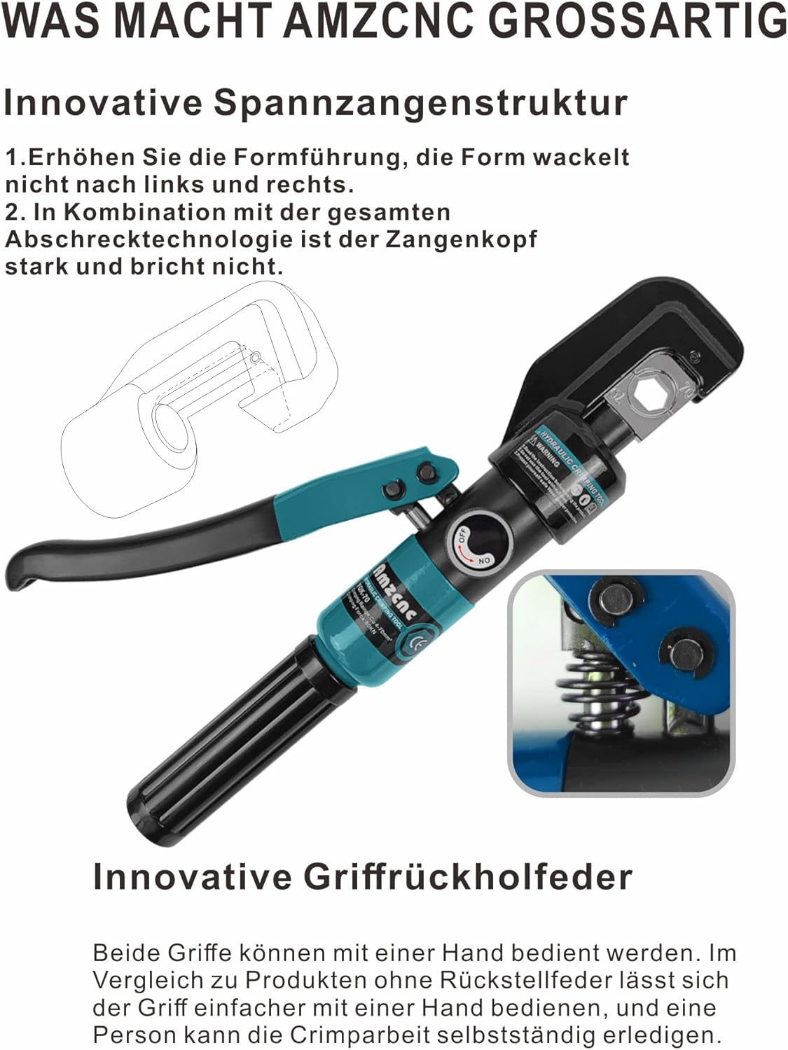 - 【VERBESSERTER ZANGENKOPF VOM C-TYP】 Der Zangenkopf ist mit hoher Dichte geformt und nicht leicht zu brechen. Und hydraulische Crimpwerkzeuge sind für verschiedene Arbeitsumgebungen geeignet.Das innovative Design der Formführungsnut eliminiert die schwierige Positionierung der Formrotation.