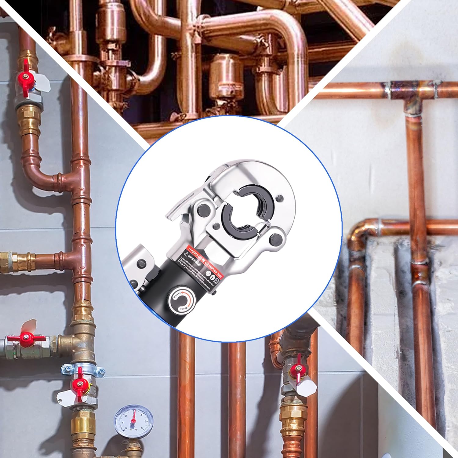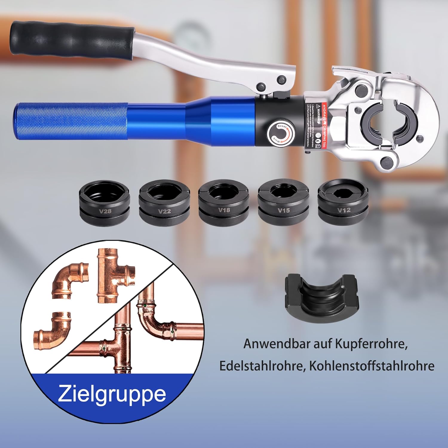 - V-Kontur ( Presskontur ) mit Pressbacken in 12mm, 15mm, 18mm, 22mm, 28mm für Kupferrohr, C-Stahlrohr und Edelstahlrohre verwendbar ( siehe Hersteller unten )