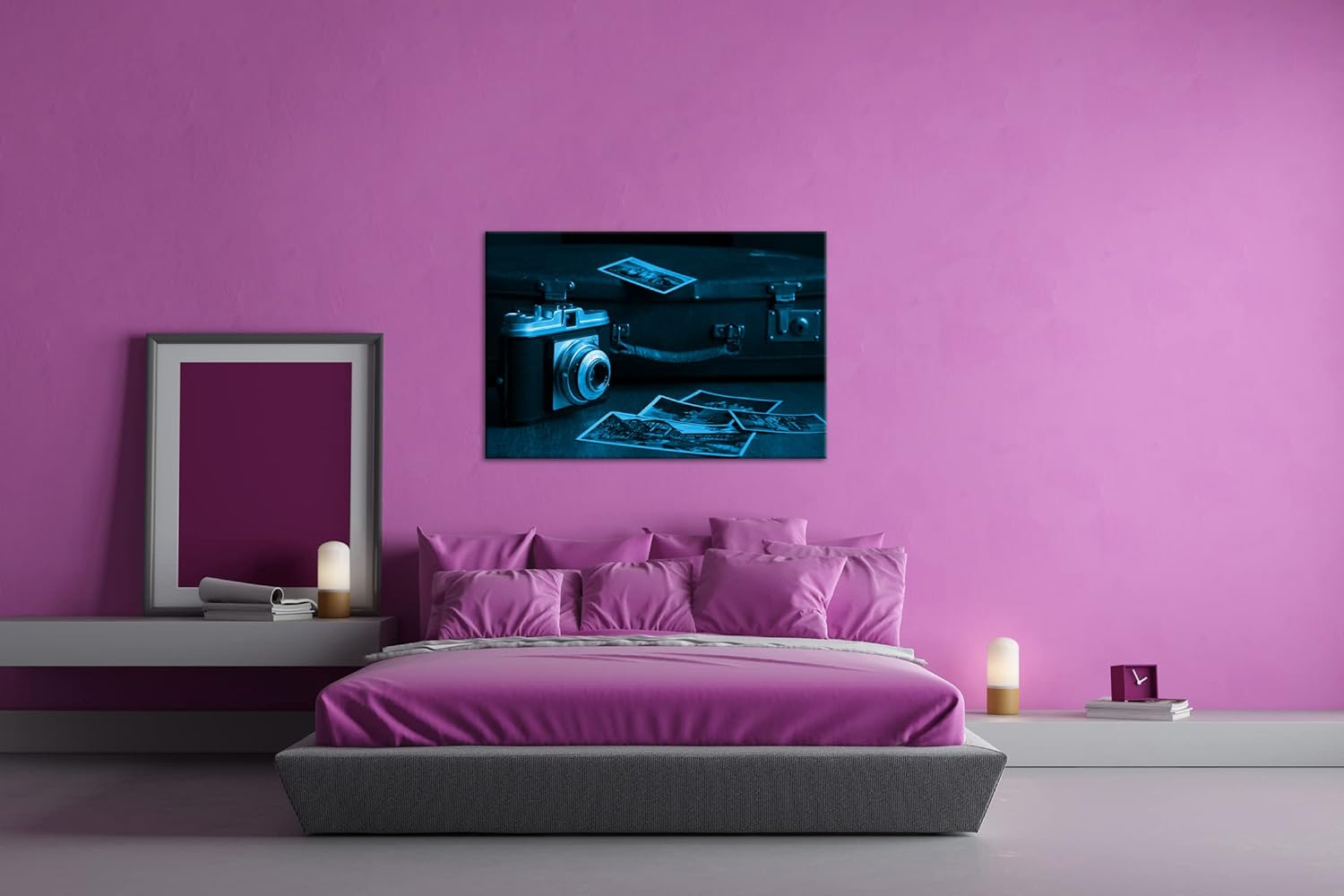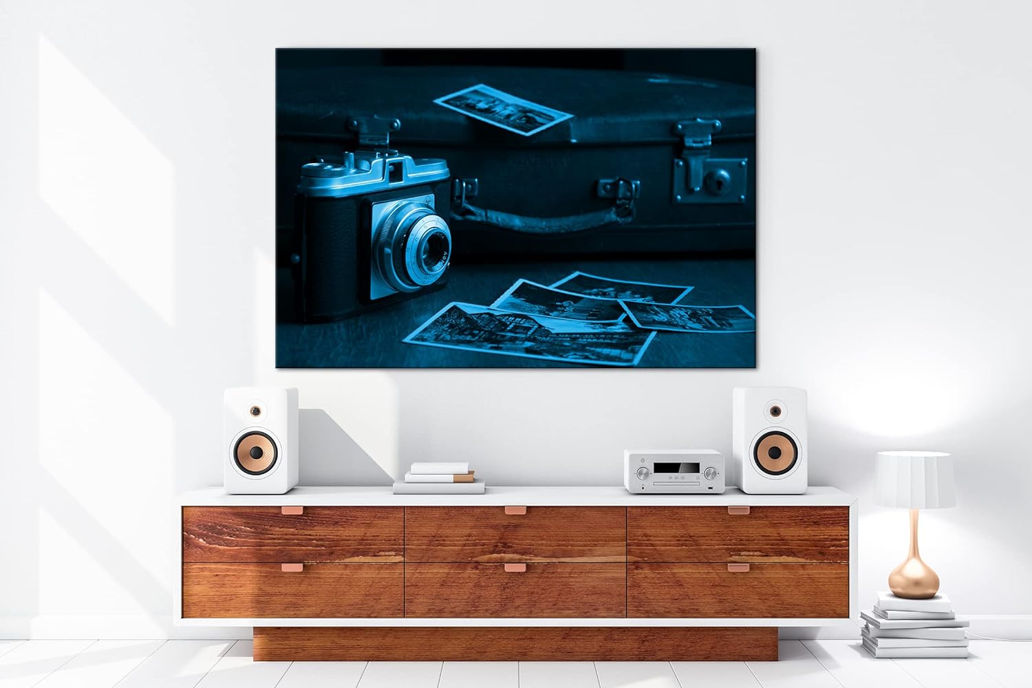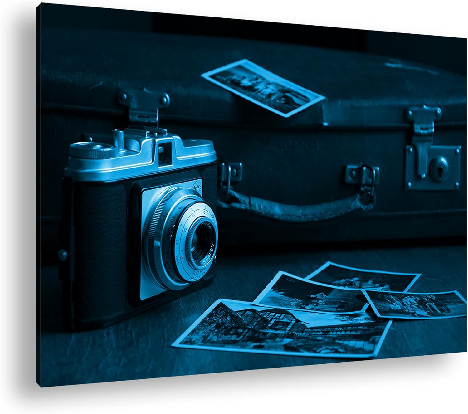 deyoli Analoge auf Fotoapparat vor altem Koffer Format 80x60 Effekt: Monocrome Blau als Leinwandbild