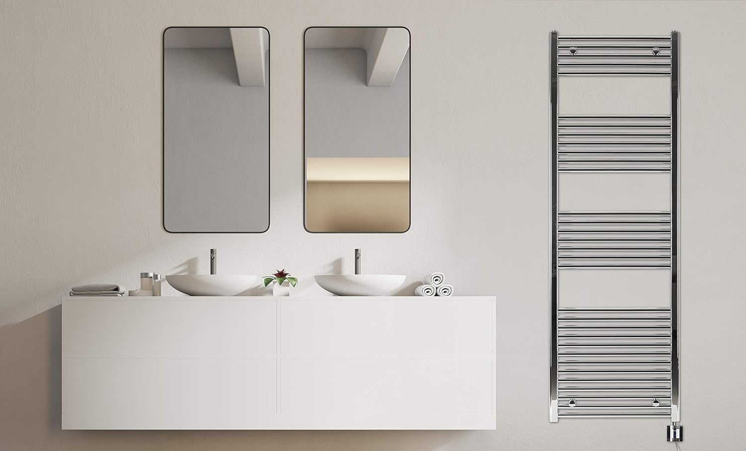 - ✅ Elektrobadheizkörper Grösse: 1775h x 500b (mm) chrom / gerade, Leistungsaufnahme Heizpatrone: max. 1000 Watt, Ausreichend für Raumgrösse: ca. 5 m² , 4 Heizzeiten einstellbar. Die Heizkörpertemperatur kann auf das °C genau geregelt werden.