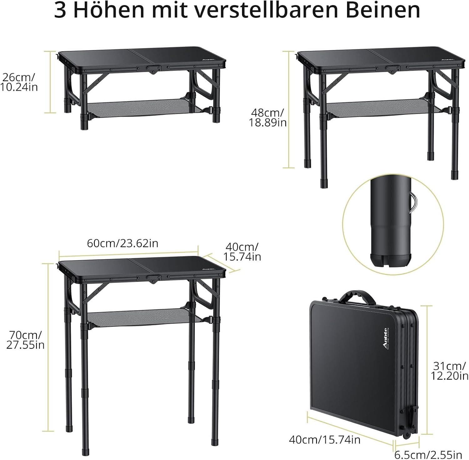 - 【3 HÖHEN MIT VERSTELLBAREN BEINEN】 Anbte Campingtisch hat 3 höheverstellbare Tischbeine von 25,4cm, 49,2cm und 66,7cm. Sie können beim Picknick mit der niedrigsten Höhe auf der Wiese sitzen. Oder Sie sitzen neben dem Tisch mit Stuhl, wenn der