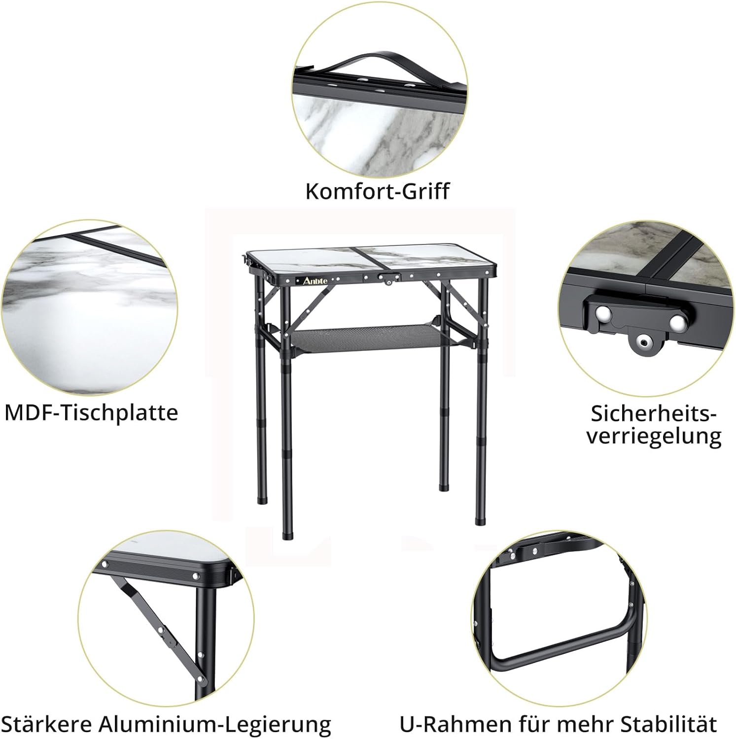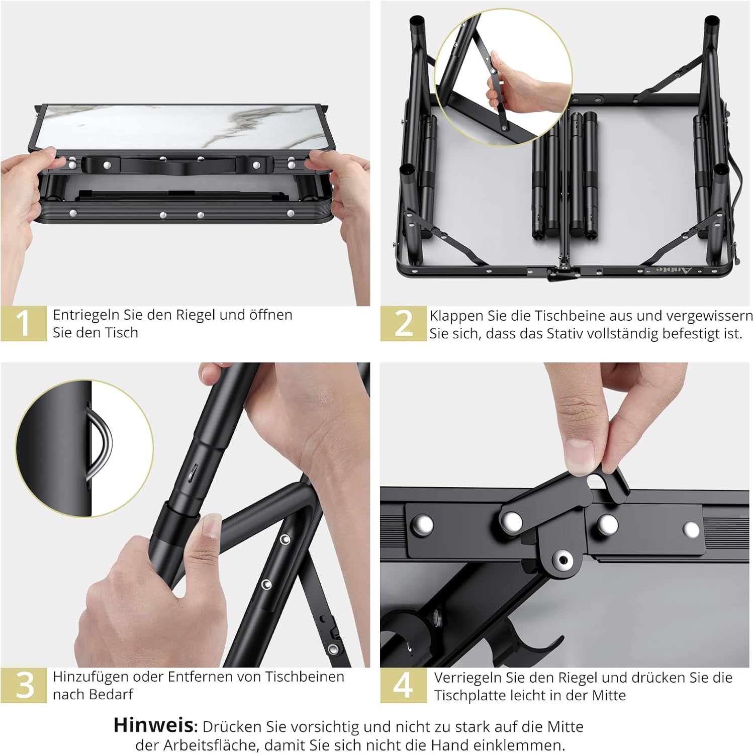 - 【TIPPS ZUR VERWENDUNG】1) Die Abmessungen unserer Campingtische werden alle von Hand gemessen, bitte erlauben Sie einen Fehler von ca. 1-2 cm. 2) Dieser Tisch stellt die Höhe durch Einführen und Herausziehen des Beins ein, bitte verwenden Sie es an