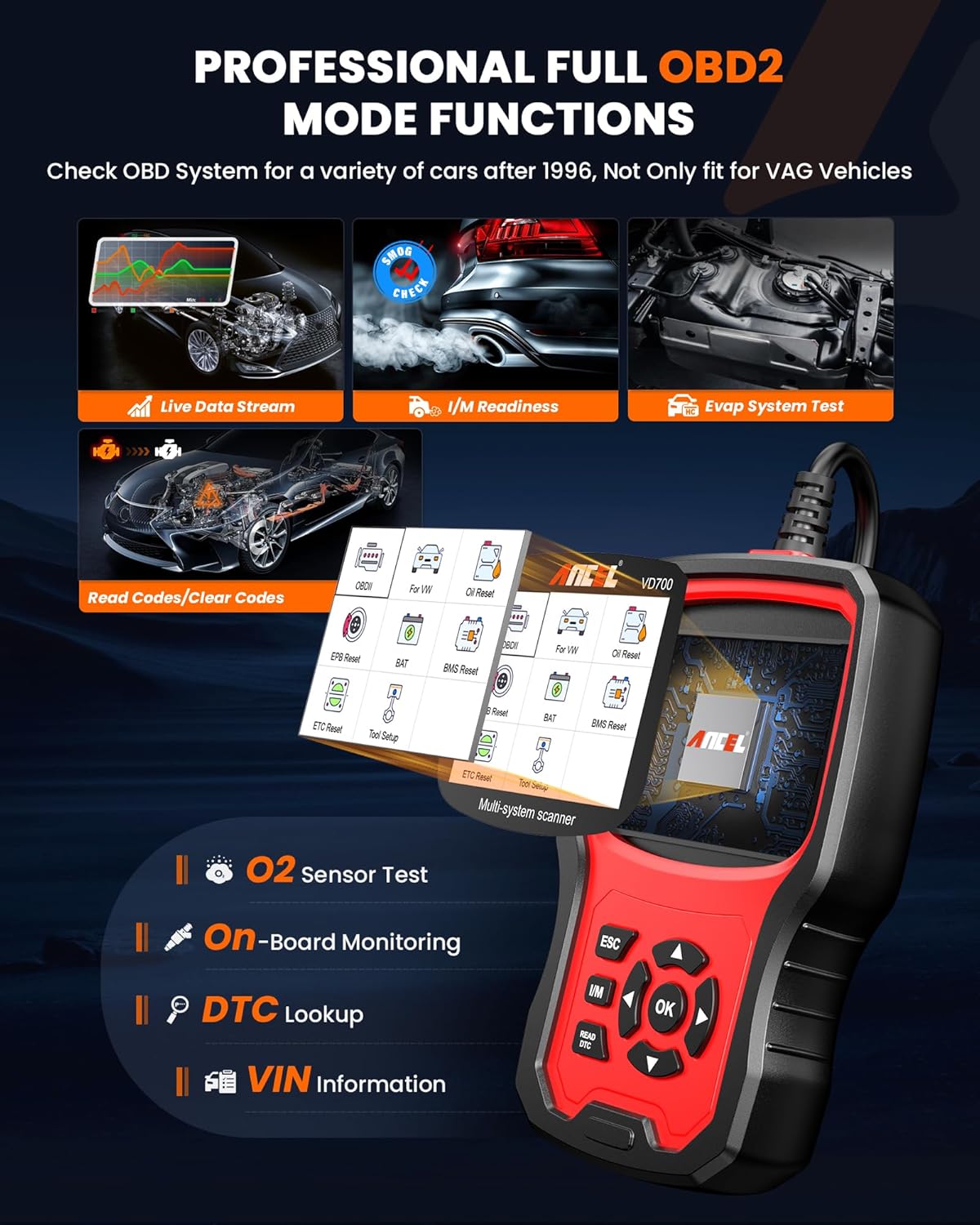 - 【Vollständige Systemdiagnose für VAG】Mit den Grundfunktionen für Fahrzeuge von Volkswagen (VAG) kann der ANCEL Upgraded Version OBD2 Diagnosegerät eine vollständige Systemdiagnose durchführen (ABS, Getriebe, SAS, SRS, ESP, TPMS und weitere