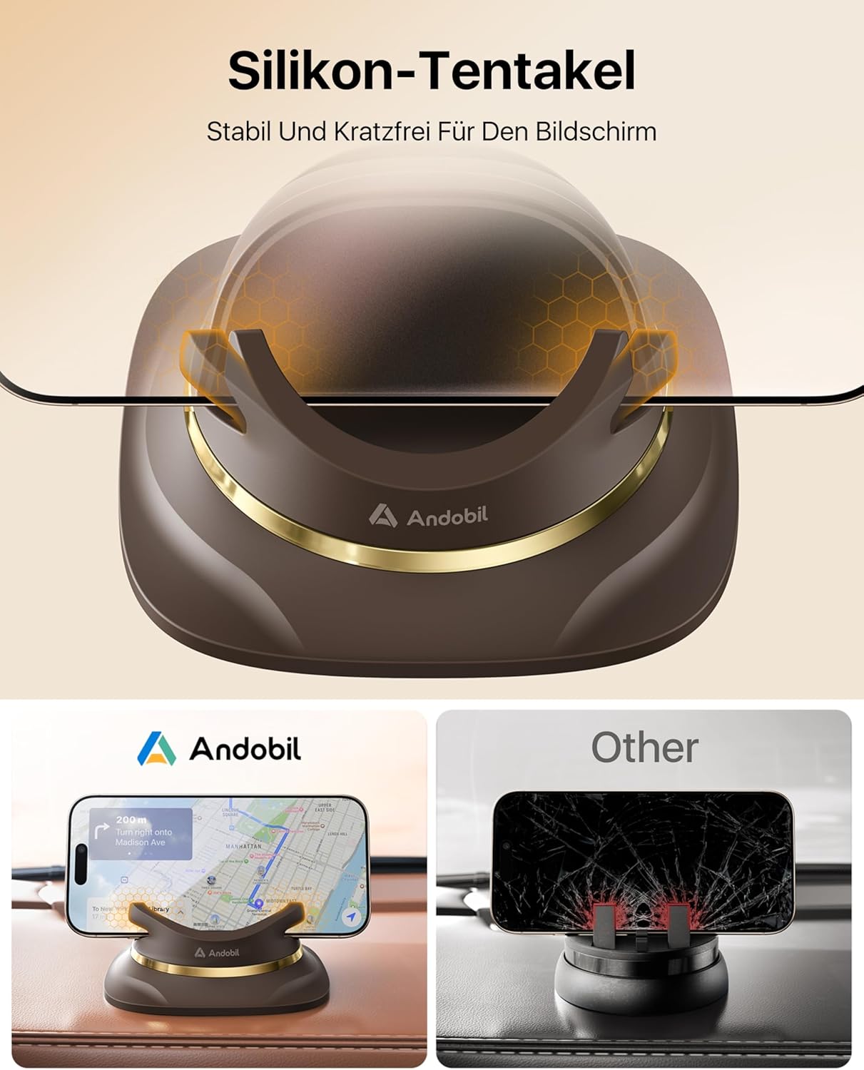 - [ Silikontentakel – Fixieren Sie Ihr Handy fest ] – Dank der rutschfesten Tentakel aus Vollsilikonmaterial und der rutschfesten Rückwandstruktur vermeidet die Andobil-Autohalterung ein Verkratzen Ihres Handys, während sie problemlos 99% Ihrer