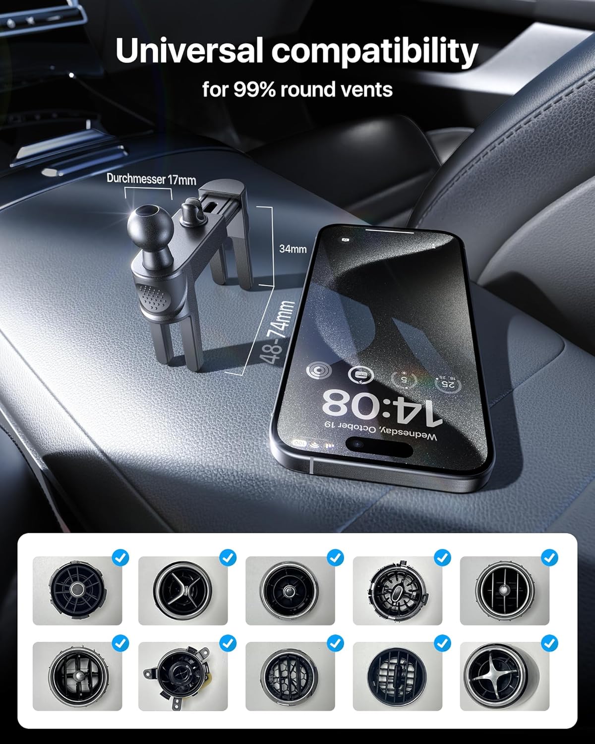 - [Konzipiert für runde Lüftungsöffnungen]Passend für 99% der runden Klimaanlagenmodell-Autohalterungen, nicht leicht abzufallen beim Fahren. Bitte bestätigen Sie Ihre Modellreihe vor dem Kauf, der Telefonhalter kann für alle folgenden Modelle
