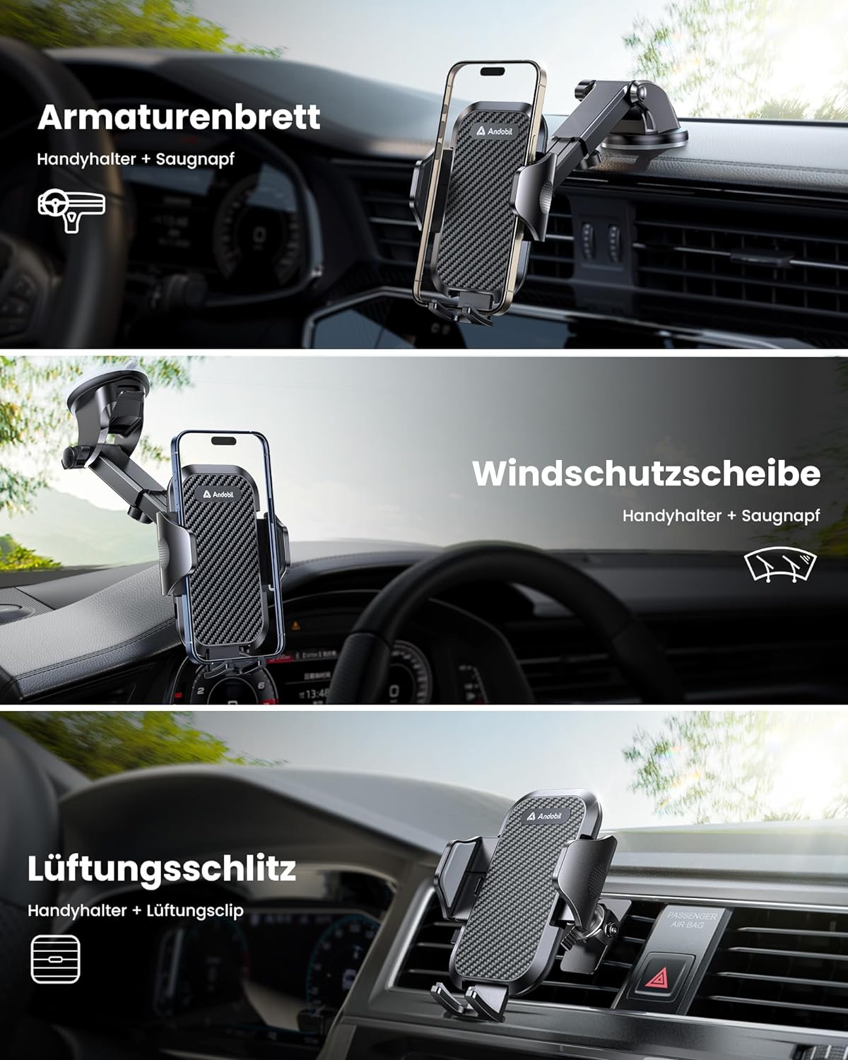 - MIT STABILERER LÜFTEUNGSCLIP UND SAUGNAPFSHALTER: Unsere Halterung ist mit starkem Lüftungsklammer und Saugnapfshalter, damit kann man die Halterung flexibel auf mehreren Positionen montieren. z.B: Am Armaturenbrett, Lüftungsschlitz oder Windschutzscheibe usw. Der Lüftungsclip kann frei eingestellt und fest am Lüftungsschlitz unterschiedlicher Dicke befestigt werden. Verdicktes 3M-Gel Saugnapf für überlegene Absaugung, Stellt eine festere Installation sicher