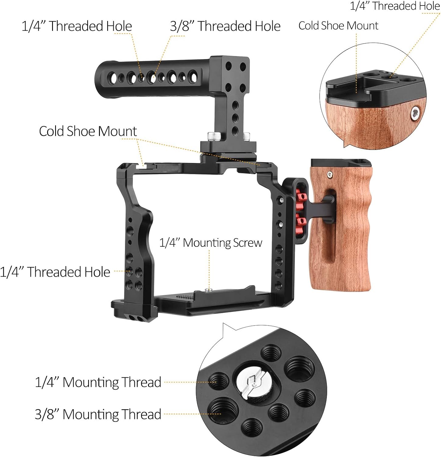 - 【Kamera-Videokäfig + oberer Griff + seitliches Holzgriff-Kit】 Der Videokäfig ist mit der S' A7IV/ A7III/ A7II/ A7R III/ A7R II/ A7S II Kamera kompatibel. Kein Blockieren der Kamerataste und des Batteriefachs. Kommt mit einem oberen Griff und einem