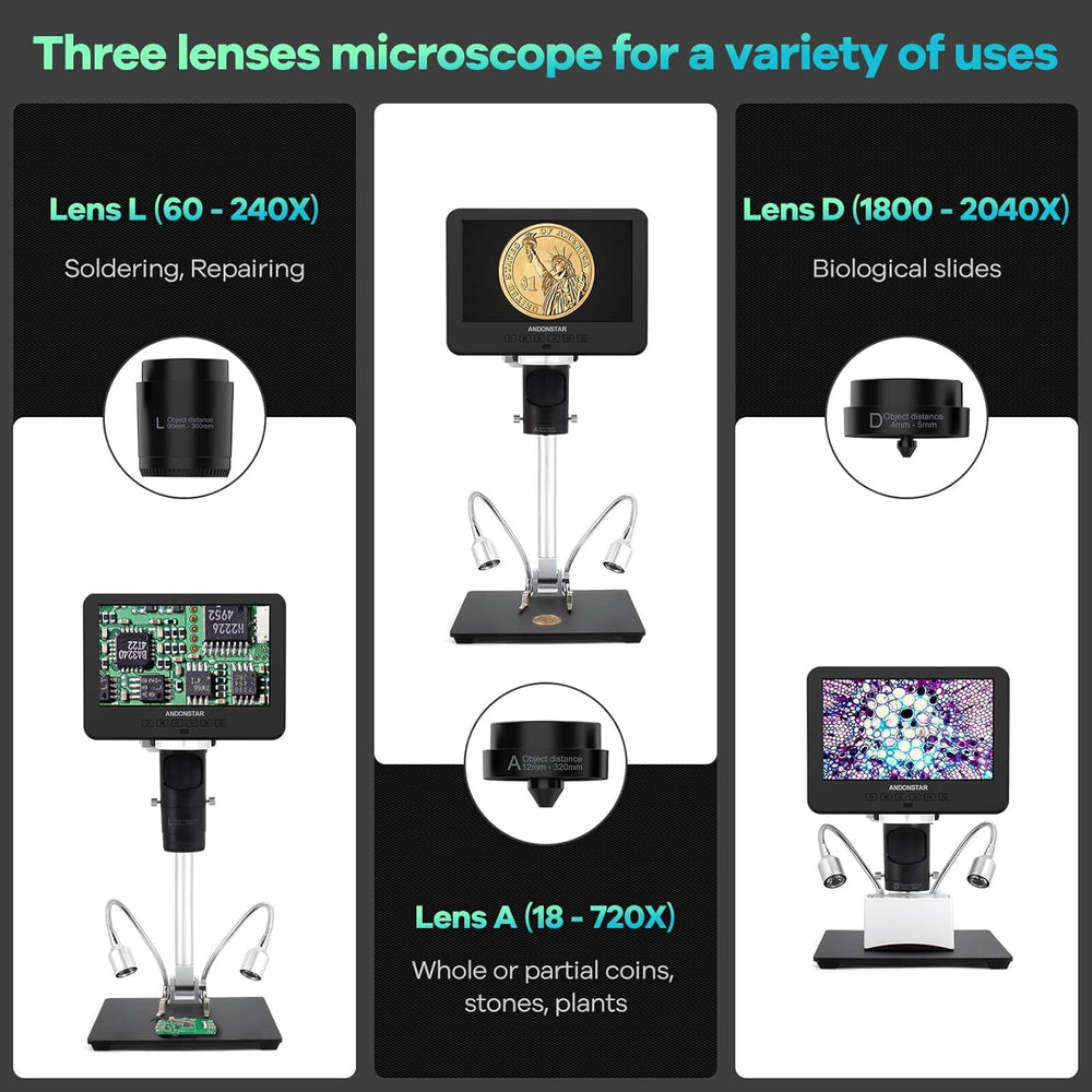 - 【USB Mikroskop mit mehreren Linsen für Erwachsene】Linse L (60-240x) zum Löten und Reparieren: Kann zum Reparieren von Leiterplatten, Mobiltelefonen usw. verwendet werden. Linse A (18-720x), kann zum Beobachten ganzer Münzen verwendet werden oder Teile, Pflanzen, Steine usw. Objektiv D (1800-2040x), kann verwendet werden, um biologische Objektträger zu beobachten.