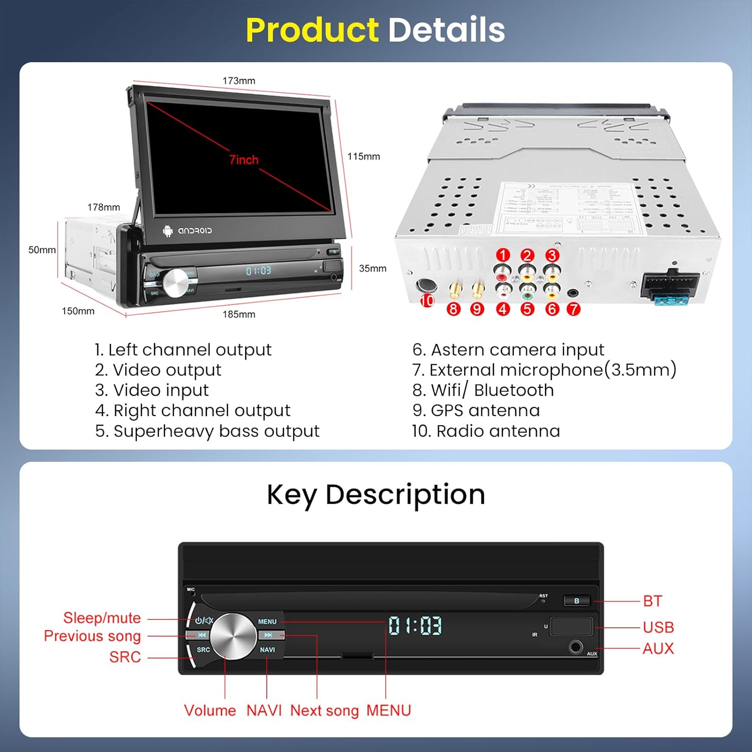 - 【Android Car Multimedia Player】2GB RAM ensure smooth operation and faster response. 32GB ROM supports more apps installed. This is a 1 din Android 10.0 car radio with 7 inch HD 1080P screen smart navigation, foldable capacitive touch screen. The screen resolution is 1024 * 600. The car radio supports WIFI, GPS navigation, Bluetooth, FM radio, Phone Mirror Link, Steering wheel control, with a 12 LEDs rear view camera and Microphone. Installtion size: 178*50mm