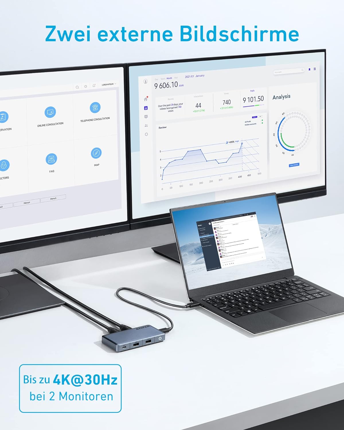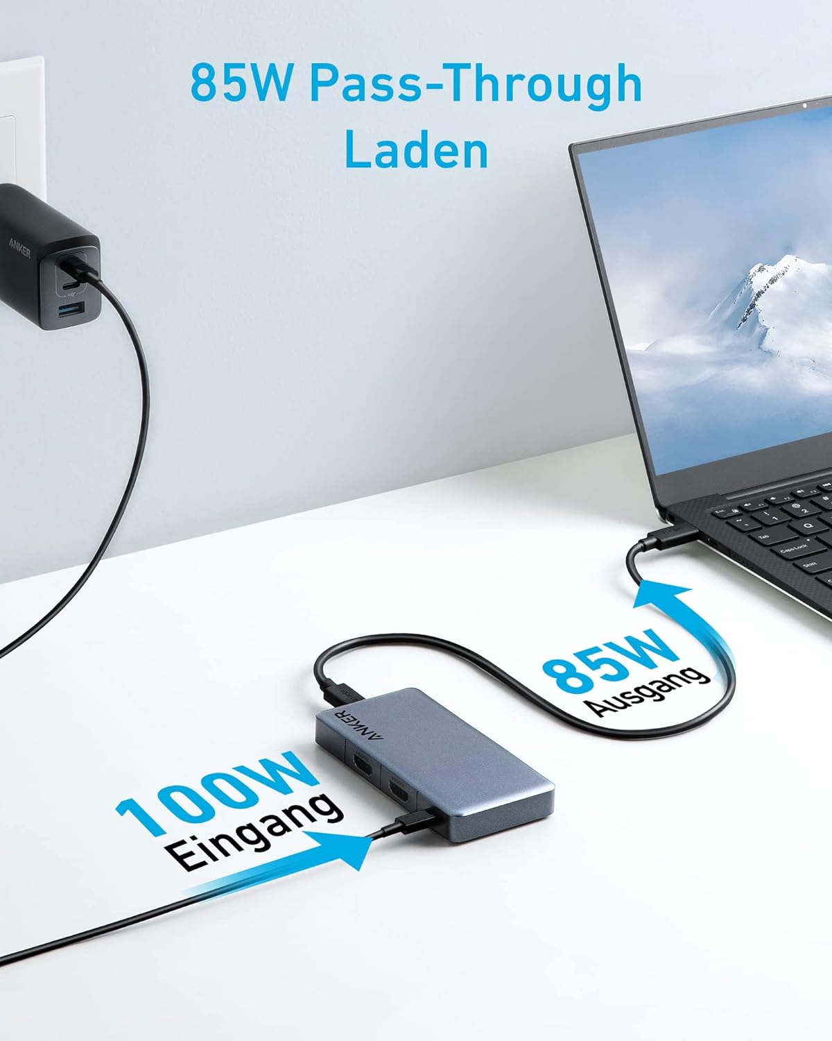 Anker 343 USB C Hub (7-in-1) mit 100W Power Delivery, Dual 4K HDMI Anschlüssen, 1x USB-C Upstream Po