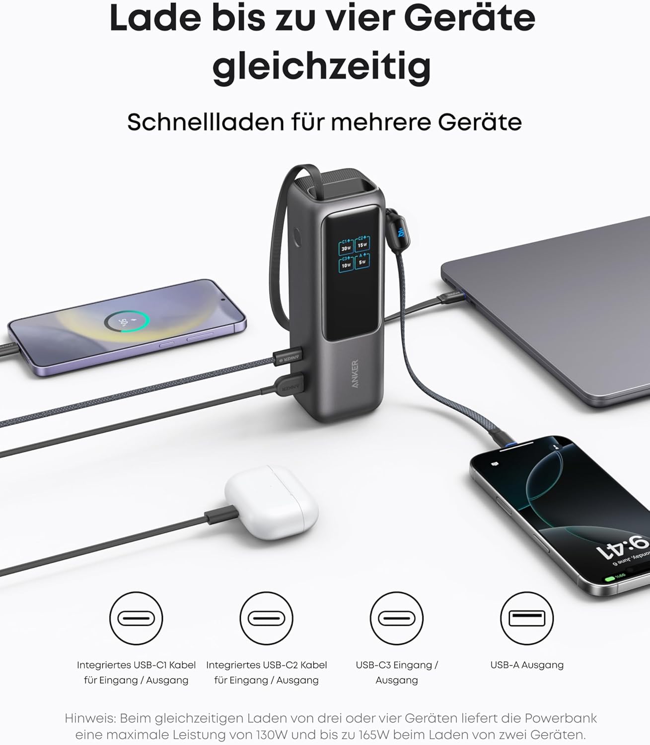 - Lade 4 Geräte gleichzeitig: Lade dein Smartphone, Tablet oder jedes andere USB-C Gerät einfach unterwegs - so geht dir nie der Strom aus. Lade bis zu vier Geräte gleichzeitig via zwei USB-C Kabel, einem USB-A Anschluss und einem USB-C Anschluss.